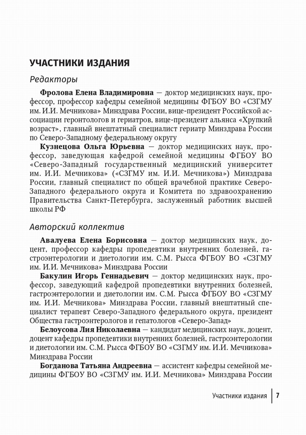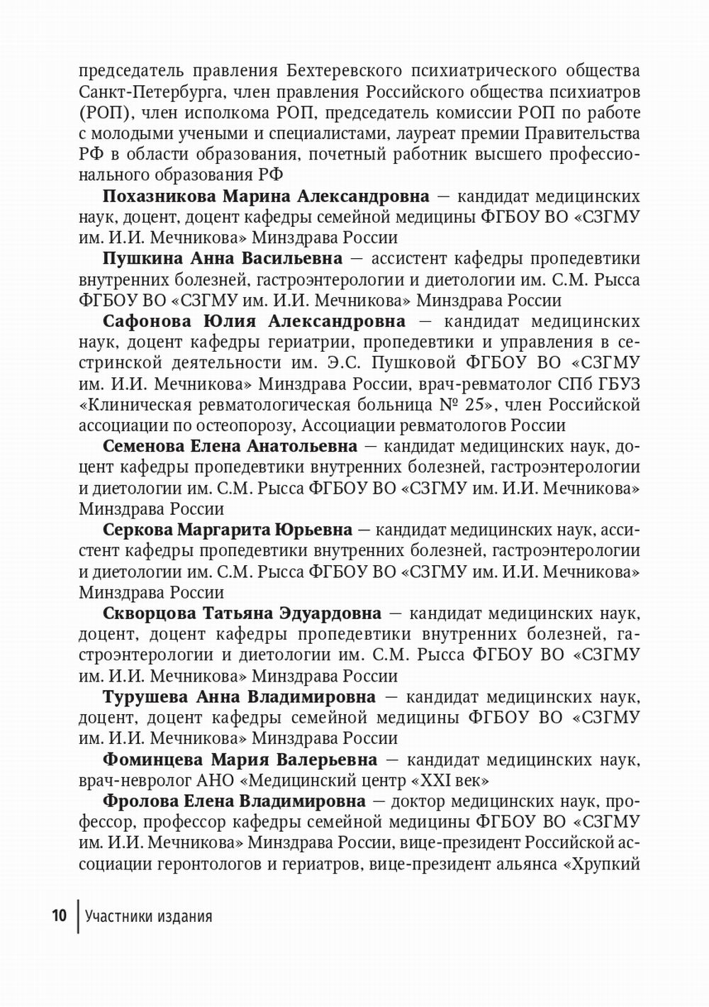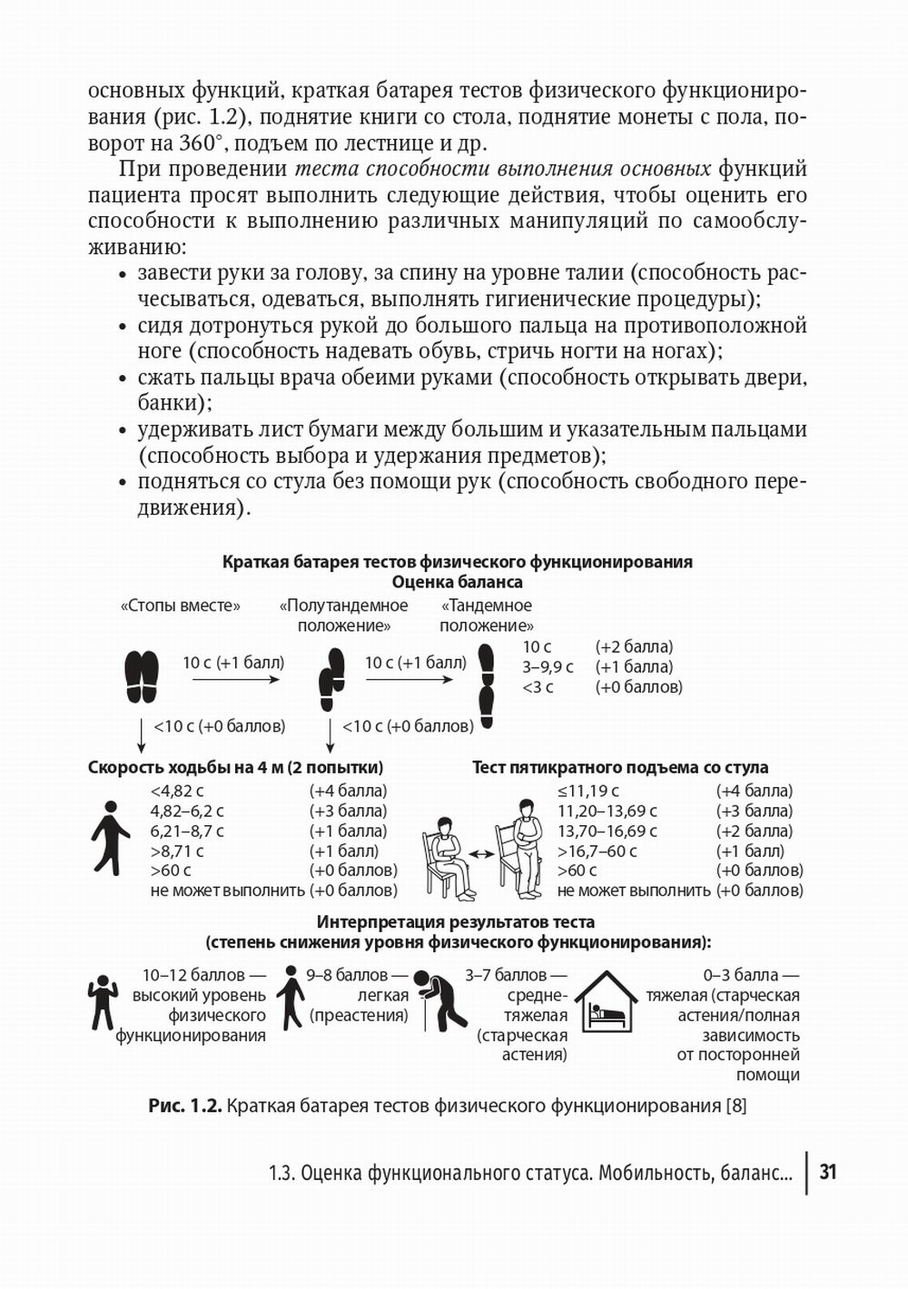 В руководство включена самая необходимая информация для врачей общей практики, участковых терапевтов (семейных врачей), оказывающих помощь людям пожилого и старческого возраста. Структура книги построена по принципу комплексного подхода к оценке состояния пожилого человека. Подробно рассмотрены гериатрические синдромы, способы их диагностики, а также самые распространенные заболевания у пожилых людей. В приложениях представлены наиболее часто используемые анкеты и опросники для выявления гериатрических синдромов и оценки степени их тяжести. В качестве иллюстраций к некоторым главам предложены видеоролики, в которых представлены клинические примеры или основные положения по диагностике и лечению заболеваний и синдромов. Руководство предназначено врачам, работающим с пожилыми людьми на первичном этапе медико-санитарной помощи, в том числе врачам общей практики (семейным врачам), врачам-терапевтам, а также может быть использовано студентами в додипломном образовании.| Издательство | ГЭОТАР-Медиа |