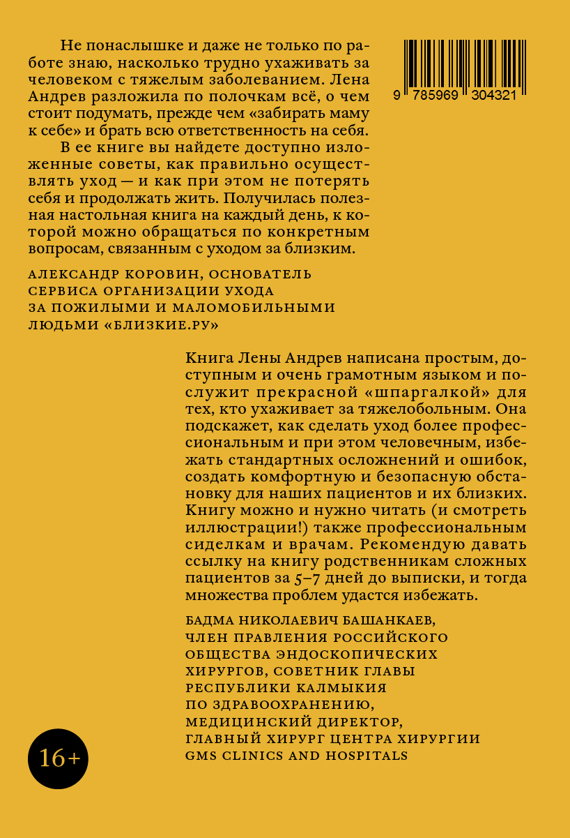 Лена Андрев - эксперт международного уровня по уходу за тяжелобольными - написала книгу, где собрала основные советы и рекомендации для тех, кому такие знания необходимы. Автор уделяет внимание самым распространенным проблемам, с которыми сталкиваются в быту близкие больных, и дает варианты их решения. Она разъясняет, как организовать безопасное и комфортное пространство, как правильно перемещать лежачего больного, как осуществлять гигиенические процедуры и при этом поддерживать душевное равновесие пациента, не забывая заботиться и о себе. Книга богато иллюстрирована, что позволяет читателю получить наглядное представление о функционировании предметов по уходу и алгоритмах своих действий. Издание будет полезно не только тем, кто осуществляет уход на дому за своим родственником, но и профессиональным сиделкам, сотрудникам патронажных служб и младшему медицинскому персоналу.| Издательство | Олимп-Бизнес |