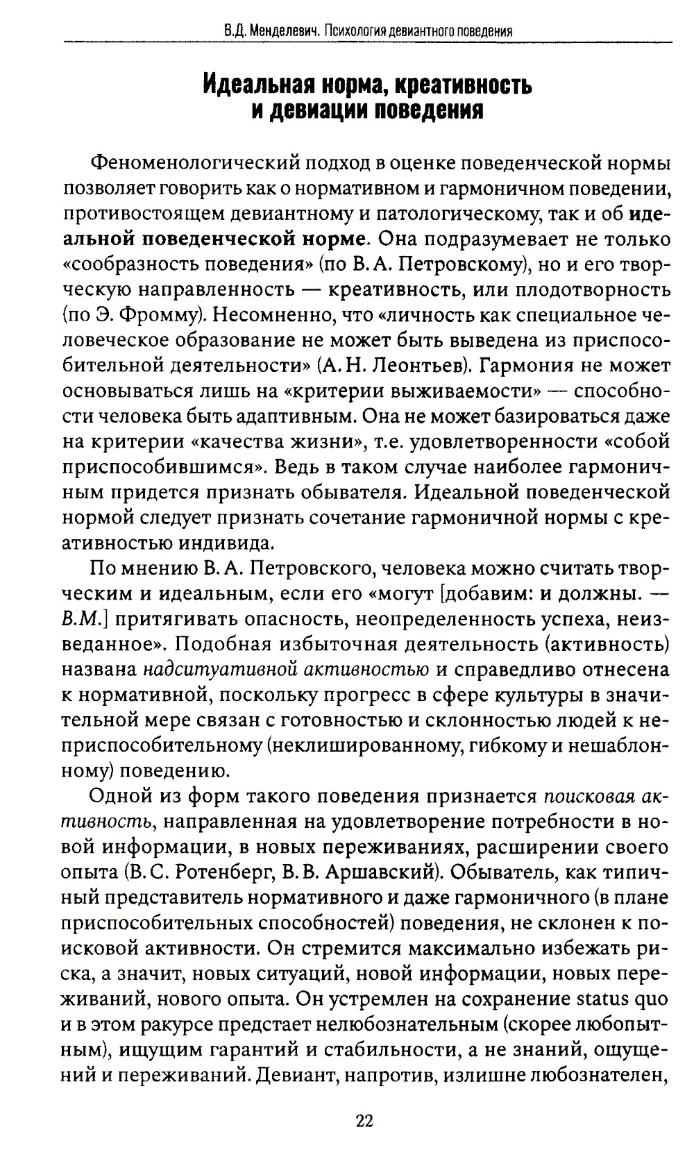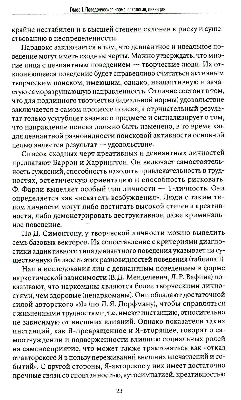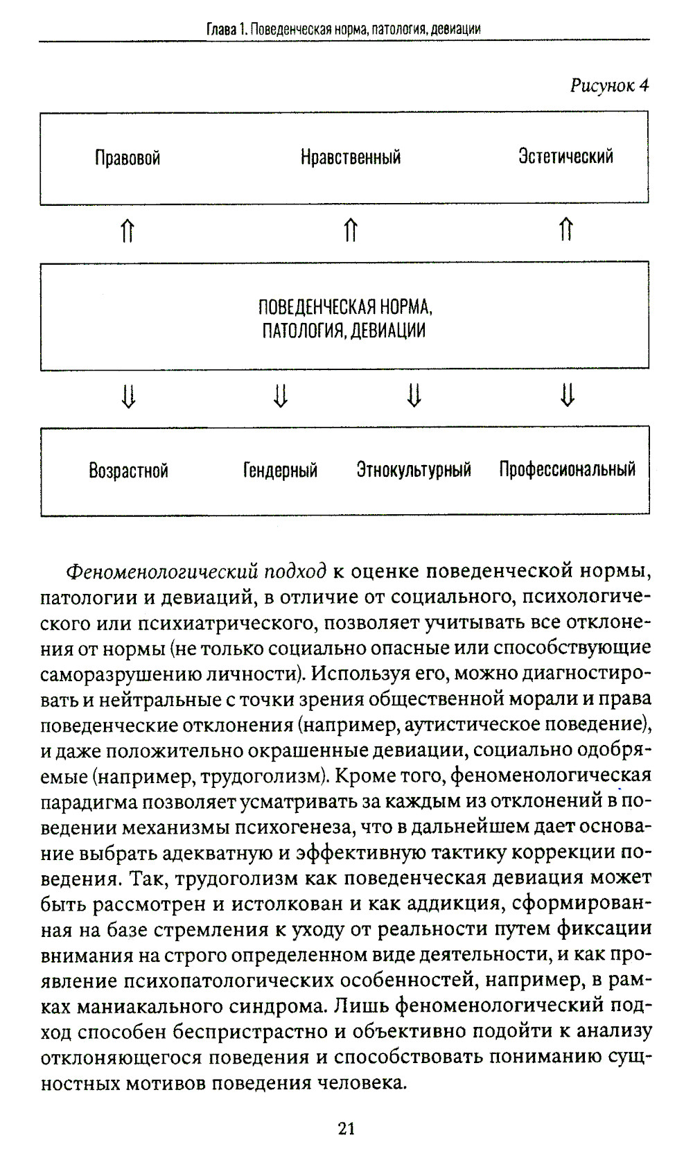 В учебном пособии представлены основные разделы психологии девиантного поведения, охватывающие описание нормативного, гармоничного, идеального поведения, а также структуры, типов и клинических форм отклоняющегося поведения у детей, подростков и взрослых. Приведены критерии пяти отклоняющихся поведенческих типов (делинквентного, аддиктивного, патохарактерологического, психопатологического и на базе гиперспособностей) в форме агрессивного, аутоагрессивного, суицидального поведения, нарушений пищевого поведения, сексуальных девиаций и перверсий, алкогольной и наркотической зависимостей, сверхценных психологических и психопатологических увлечений, коммуникативных девиаций и др. Отдельные главы посвящены культуральным, гендерным, возрастным и профессиональным девиациям, а также отклоняющемуся поведению хронически больных. Приводятся описания основ комплексной терапии и коррекции поведенческих девиаций. Учебное пособие соответствует учебному курсу «психология девиантного поведения». Оно может использоваться студентами, изучающими психологические и медицинские науки, а также врачами-психиатрами, психотерапевтами, медицинскими (клиническими) психологами, социальными работниками.| Издательство | Городец |