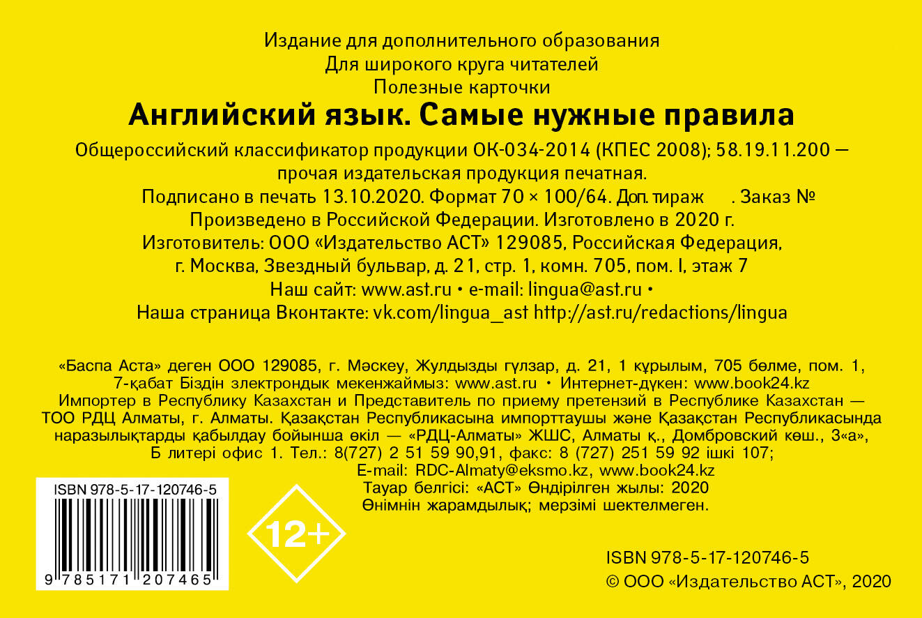 Полезные карточки "Английский язык. Самые нужные правила" - это новый способ запоминания правил английской грамматики. Удобный формат: карточки с правилами можно прикрепить куда угодно - на доску, на холодильник, на рабочий стол. Это поможет всегда обращать внимание на то, что необходимо запомнить. Данная методика способствует многократному повторению материала. Занимайтесь английским языком в дороге, дома, на работе или на отдыхе!| Издательство | ИЗДАТЕЛЬСТВО "АСТ" |