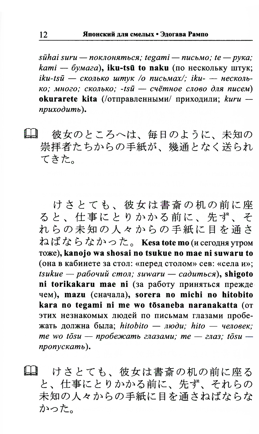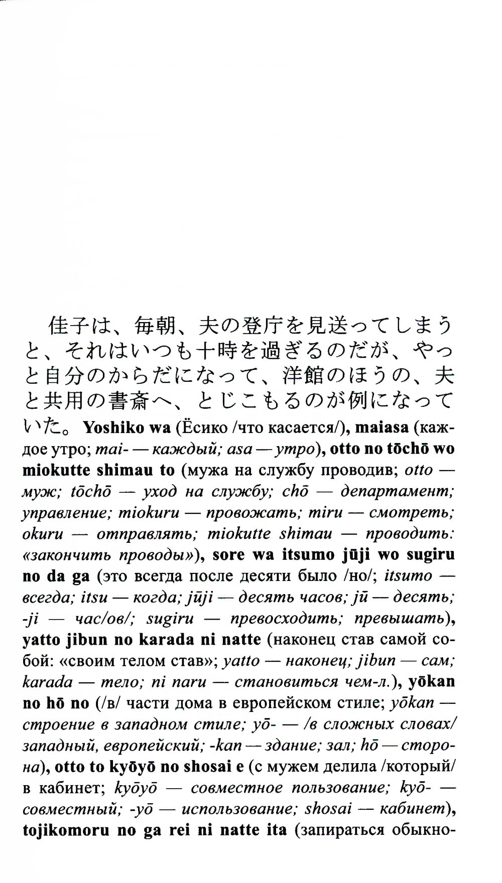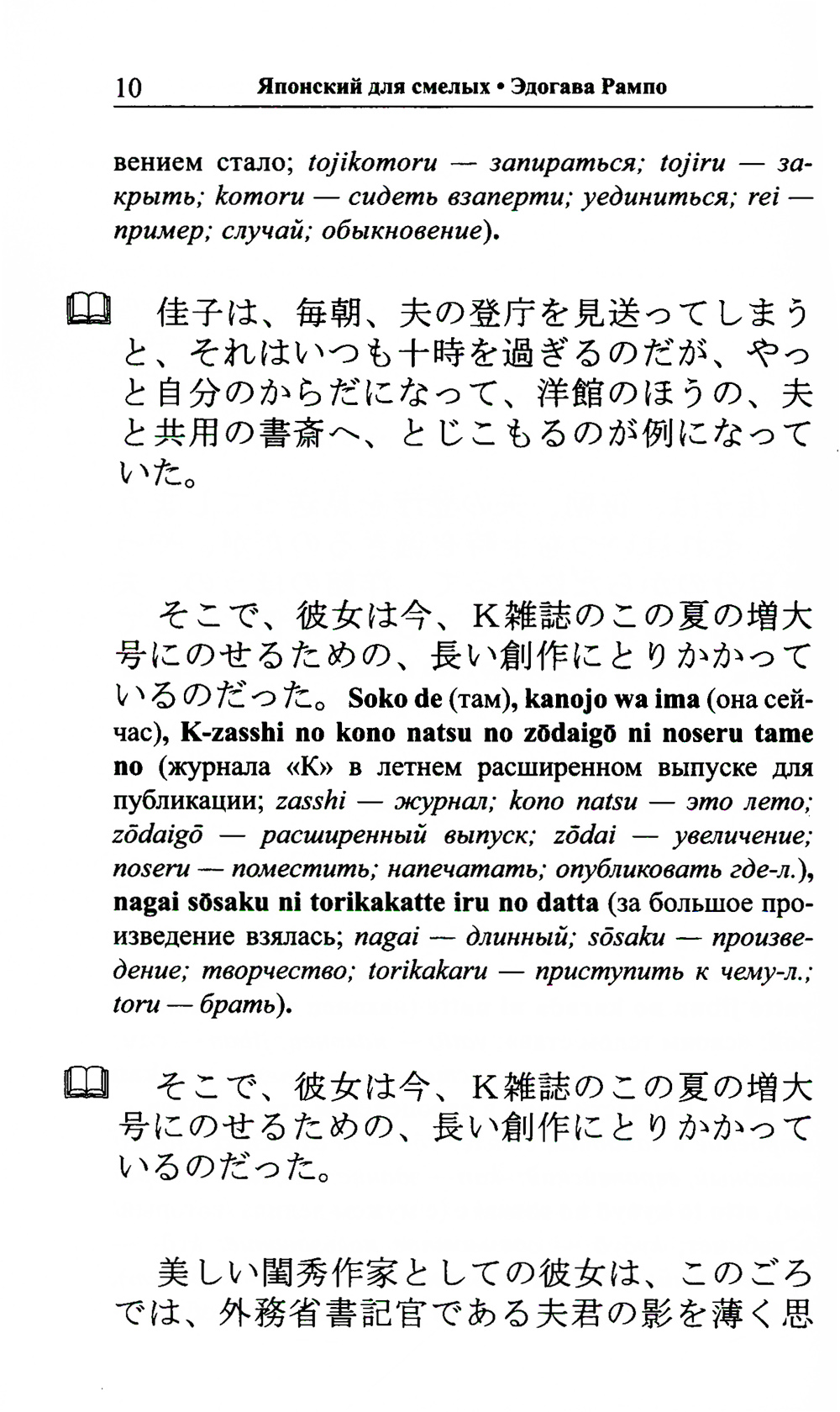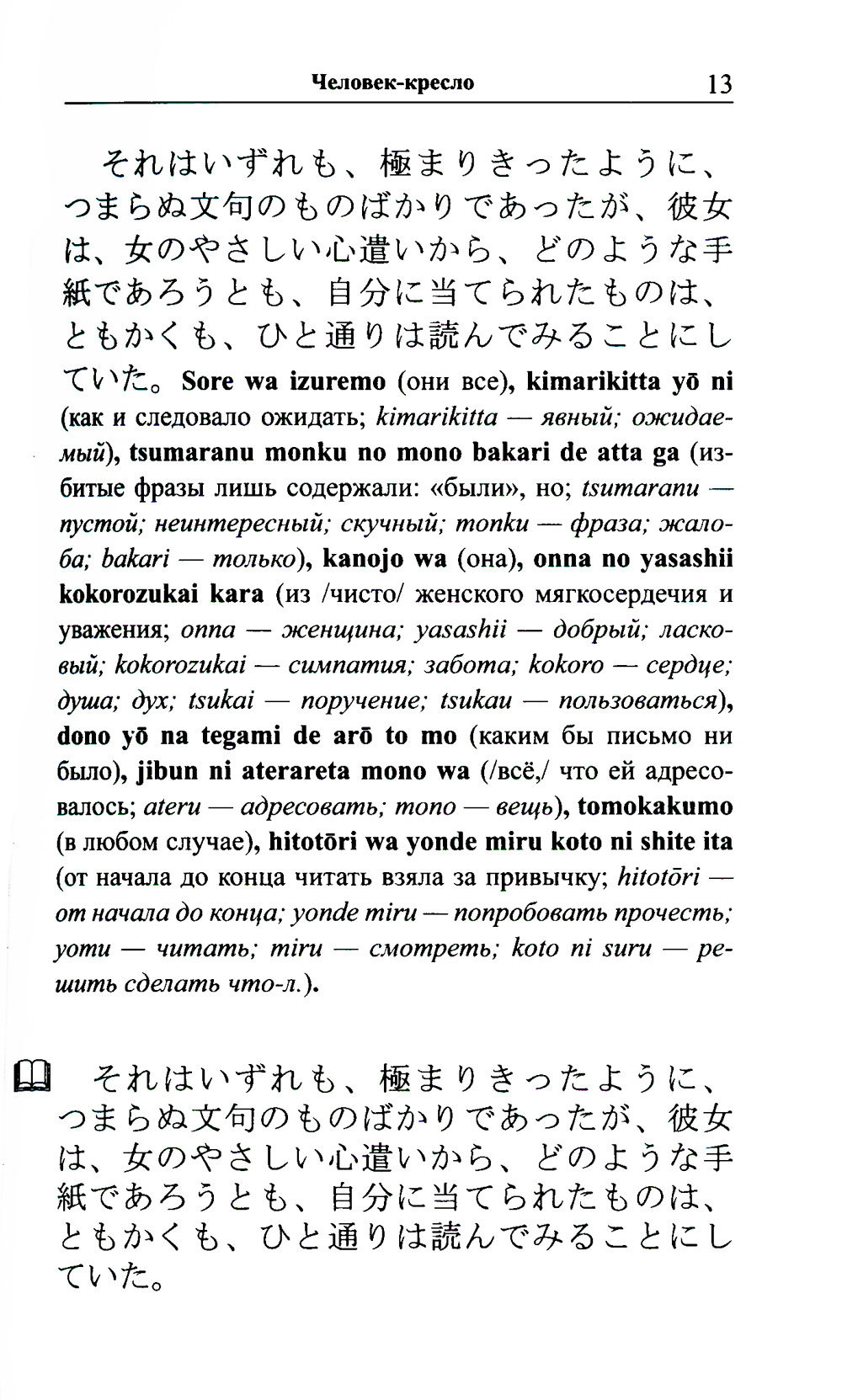 История безумца, отказавшегося от собственной жизни ради роли безмолвного наблюдателя за другими людьми, таинственной тени, срастающейся с объектами своего зловещего интереса, адаптирована в настоящем издании по методу Ильи Франка: снабжена транскрипцией, дословным переводом на русский язык и необходимым лексико-грамматическим комментарием. Уникальность метода заключается в том, что запоминание слов и выражений происходит за счет их повторяемости, без заучивания и необходимости использовать словарь. Кроме того, читатель привыкает к логике японского языка, начинает его «чувствовать». Для широкого круга лиц, изучающих японский язык и интересующихся японской культурой.