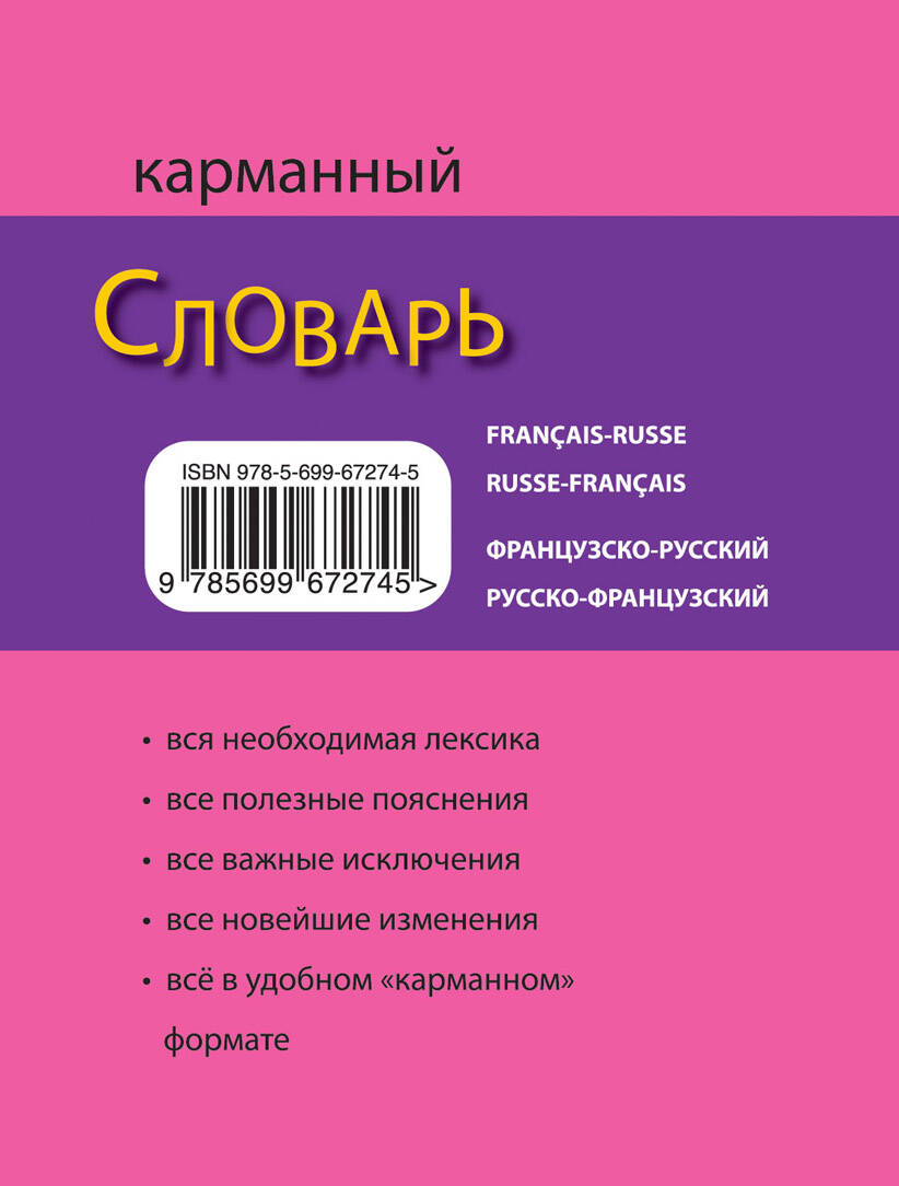 Французско-русский русско-французский карманный словарь создан специально для студентов и школьников, а также для всех, кто лишь недавно начал изучать французский язык. Компактный формат, тщательный отбор самой необходимой лексики и пояснения сложных грамматических форм сделают его удобным и незаменимым справочным пособием. С его помощью легко выполнить перевод, уточнить исключения из правил, быстро и уверенно освоить активную лексику. Словарь рассчитан на школьников и студентов, а также на широкий круг лиц, изучающих французский язык самостоятельно и с преподавателем.