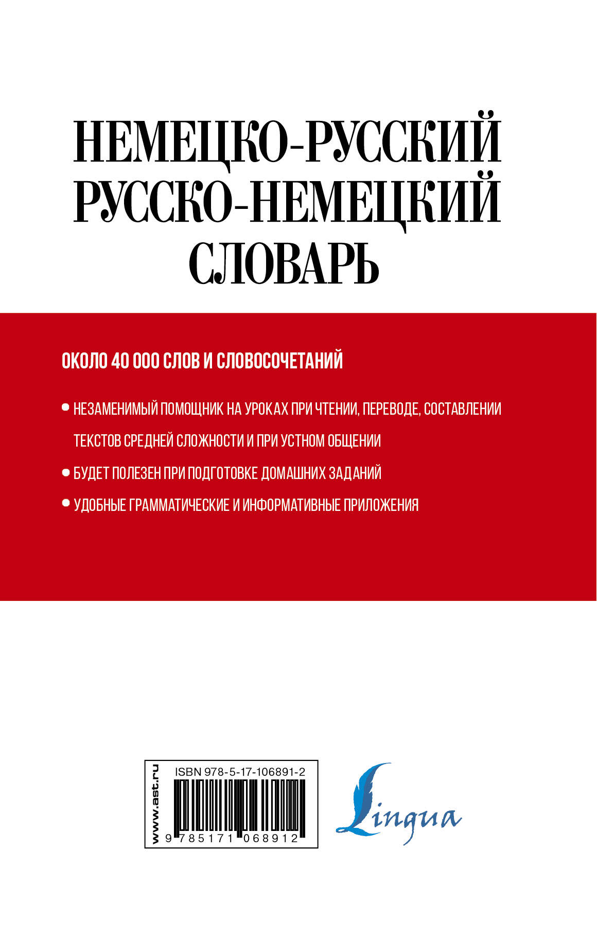 В словаре вы найдете самые необходимые слова и словосочетания, которые изучают в курсе школьной программы и не только. Словарь станет незаменимым помощником при чтении и переводе текстов различной сложности, а также поможет пополнить активный словарный запас. Словарь дополнен полезным приложением: грамматические термины; немецкие мужские и женские имена; страны, языки и национальности; Федеральные земли ФРГ; глаголы сильного и неправильного спряжения. Словарь содержит около 40 000 слов, словосочетаний и значений и предназначен для всех, кто изучает немецкий язык в школе, на курсах или самостоятельно.| Издательство | Издательство "АСТ" |