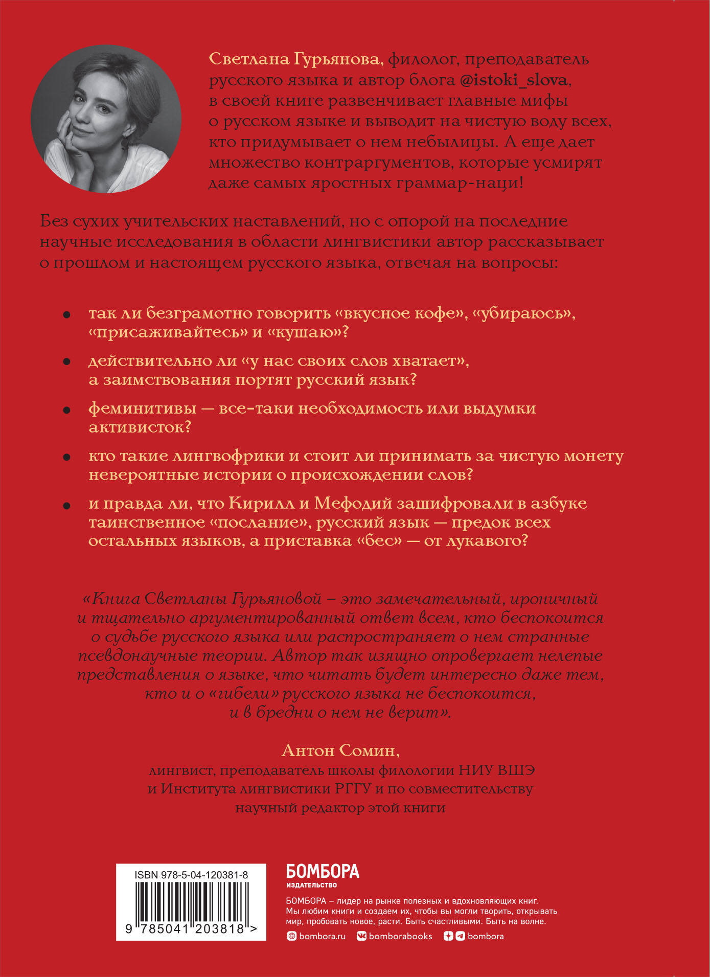 Светлана Гурьянова, филолог, преподаватель русского языка и автор блога istoki_slova, в своей книге развенчивает главные мифы о русском языке и выводит на чистую воду всех, кто придумывает о нем небылицы. А еще дает множество контраргументов, которые усмирят даже самых яростных граммар-наци! Без сухих учительских наставлений, но с опорой на последние научные исследования в области лингвистики автор рассказывает о прошлом и настоящем русского языка, отвечая на вопросы: - Так ли безграмотно говорить «вкусное кофе», «убираюсь», «присаживайтесь» и «кушаю», действительно ли «у нас своих слов хватает», а заимствования портят русский язык? - Феминитивы - все-таки необходимость или выдумки активисток? - Кто такие лингвофрики и стоит ли принимать за чистую монету невероятные истории о происхождении слов? - И правда ли, что Кирилл и Мефодий зашифровали в азбуке таинственное «послание», русский язык - предок всех остальных языков, а приставка «бес» - от лукавого? ОТЗЫВ: «Книга Светланы Гурьяновой - это замечательный, ироничный и тщательно аргументированный ответ всем, кто беспокоится о судьбе русского языка или распространяет о нем странные псевдонаучные теории. Автор так изящно опровергает нелепые представления о языке, что читать будет интересно даже тем, кто и о «гибели» русского языка не беспокоится, и в бредни о нем не верит». - Антон Сомин, лингвист, преподаватель школы филологии НИУ ВШЭ и Института лингвистики РГГУ и по совместительству научный редактор этой книги| Издательство | ООО "Издательство "Эксмо" |