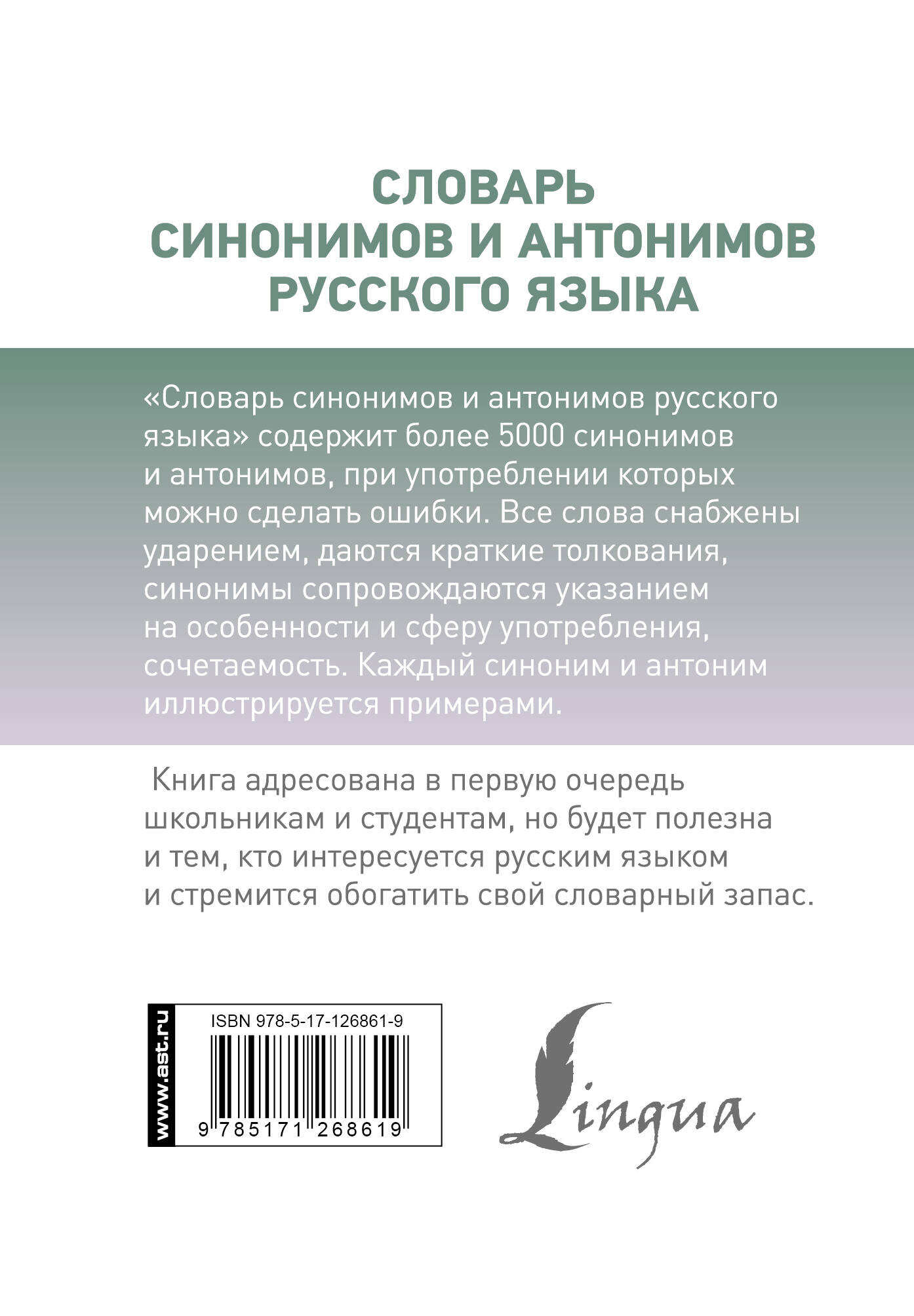 "Словарь синонимов и антонимов русского языка" содержит более 5000 слов. Все слова, кроме односложных, снабжены ударением. К каждому слову даётся краткое толкование, синонимы сопровождаются стилистическими пометами. Словарные статьи проиллюстрированы примерами. Издание предназначено для учащихся школ, студентов и преподавателей. Станет хорошим помощником при подготовке к урокам и экзаменам. Книга поможет также тем, кто стремится лучше овладеть родным языком, повысить культуру речи, обогатить свой словарный запас.| Издательство | Издательство "АСТ" |