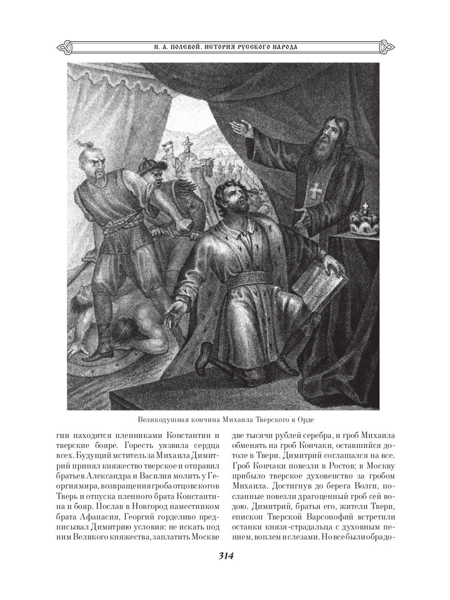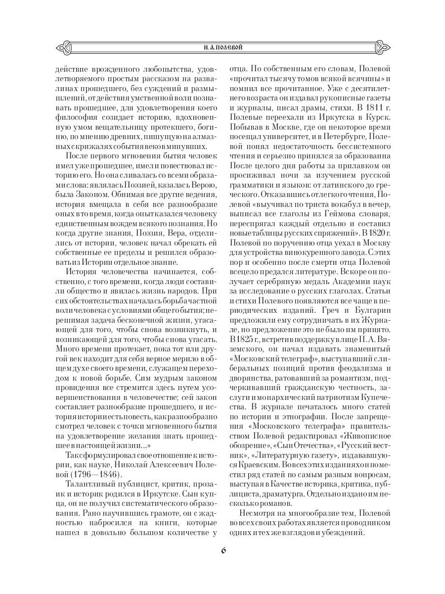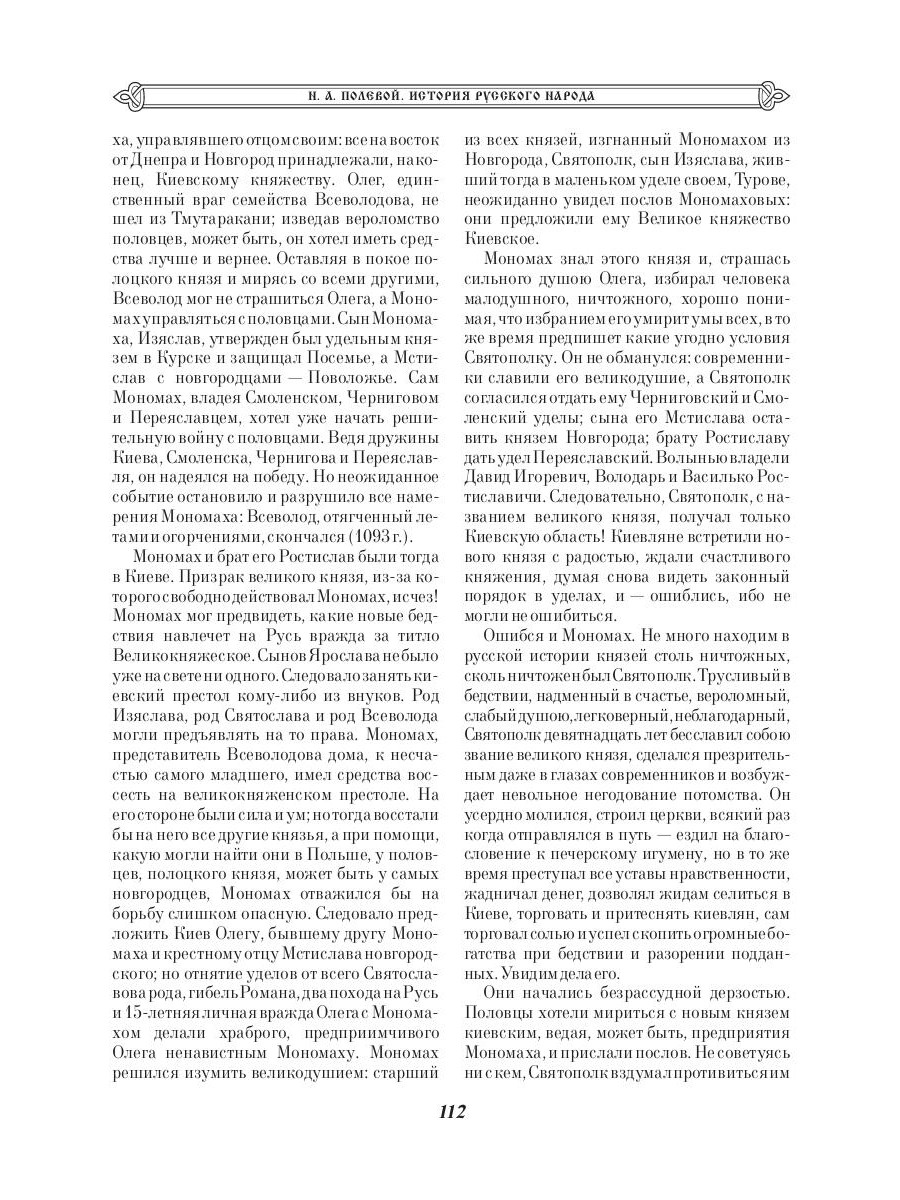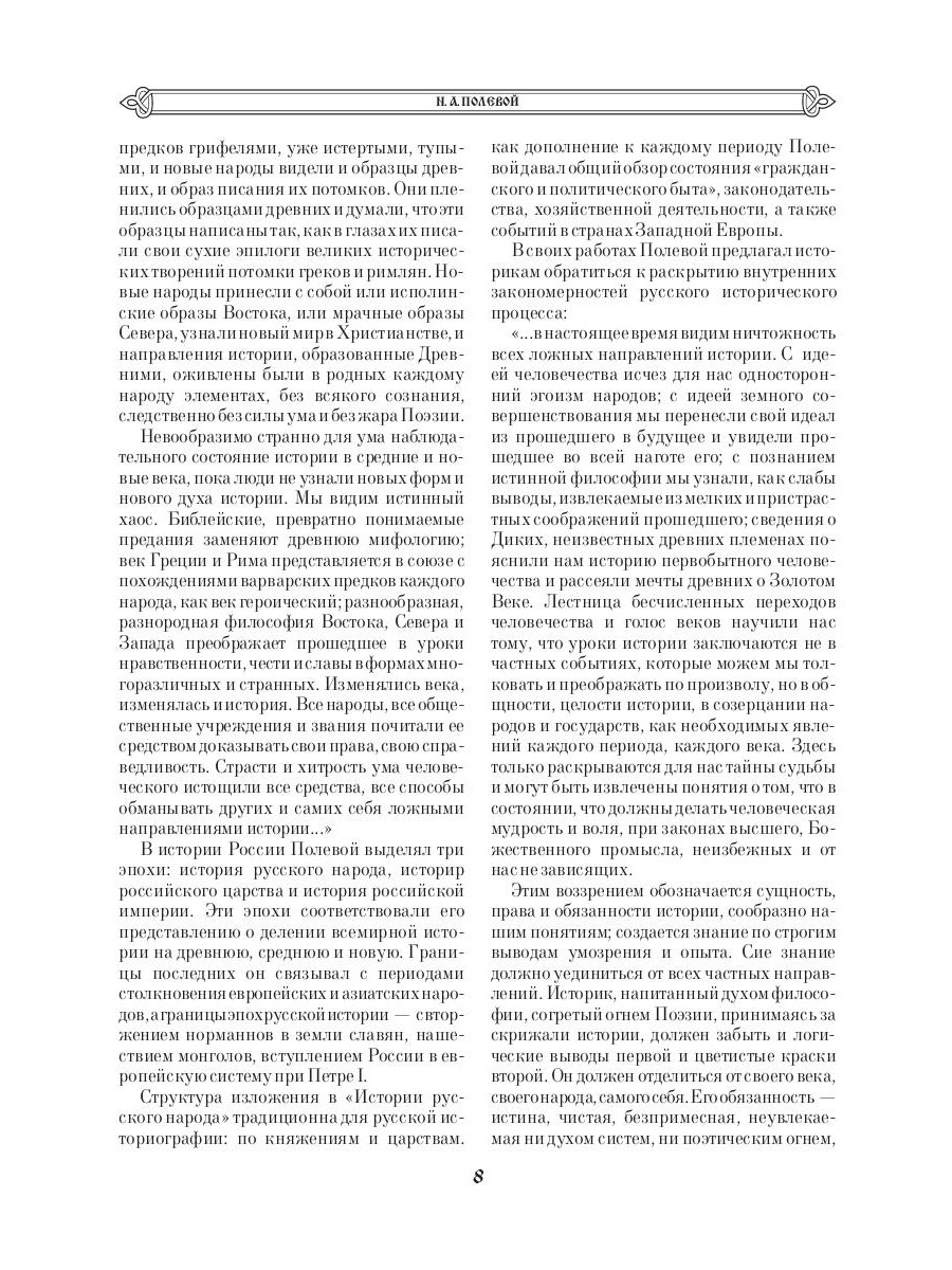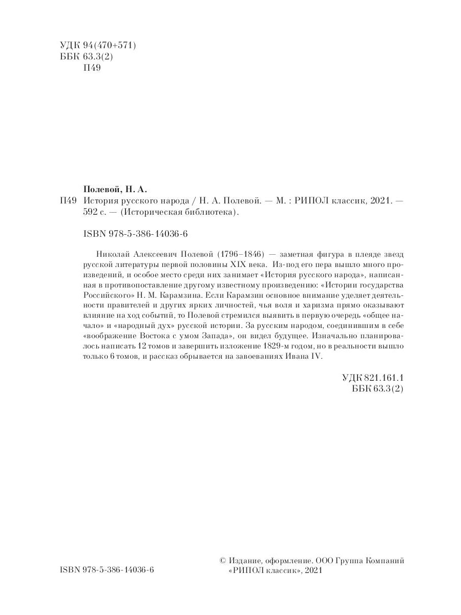 Николай Алексеевич Полевой (1796-1846) - заметная фигура в плеяде звезд русской литературы первой половины XIX века. Из-под его пера вышло много произведений, и особое место среди них занимает «История русского народа», написанная в противопоставление другому известному произведению: «Истории государства Российского» Н.М. Карамзина. Если Карамзин основное внимание уделяет деятельности правителей и других ярких личностей, чья воля и харизма прямо оказывают влияние на ход событий, то Полевой стремился выявить в первую очередь «общее начало» и «народный дух» русской истории. За русским народом, соединившим в себе «воображение Востока с умом Запада», он видел будущее. Изначально планировалось написать 12 томов и завершить изложение 1829-м годом, но в реальности вышло только 6 томов, и рассказ обрывается на завоеваниях Ивана IV.| Издательство | Рипол Классик |