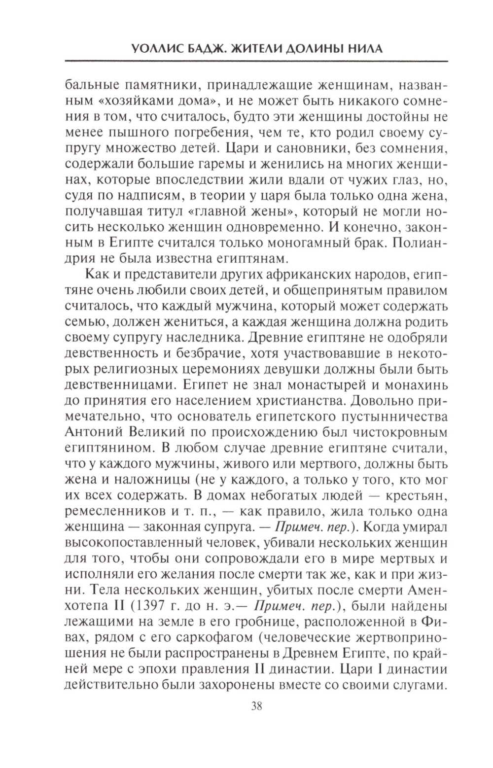 Первым централизованным государством в истории человечества, несомненно, был Египет, рожденный Нилом, с единой религией и культурой, с общими для всех жителей этическими ценностями и табу. В книге Уоллиса Баджа описана жизнь древнего египтянина от колыбели до могилы. Он повествует о становлении и развитии власти царей над объединенным Египтом, перечисляя имена, которые известны благодаря сохранившимся памятникам. Ученый создает панораму повседневной жизни различных слоев египетского общества: жрецов, придворных, полководцев и воинов, писцов, гончаров, музыкантов и крестьян. Приводит в доказательство своих воззрений мнения многих исследователей, излагает их теории, подкрепляя цитатами из папирусов и сведениями последних археологических находок. Особенно ярко Бадж рисует таинственный мир верований, ритуалов и церемоний древних египтян.| Издательство | Центрполиграф |