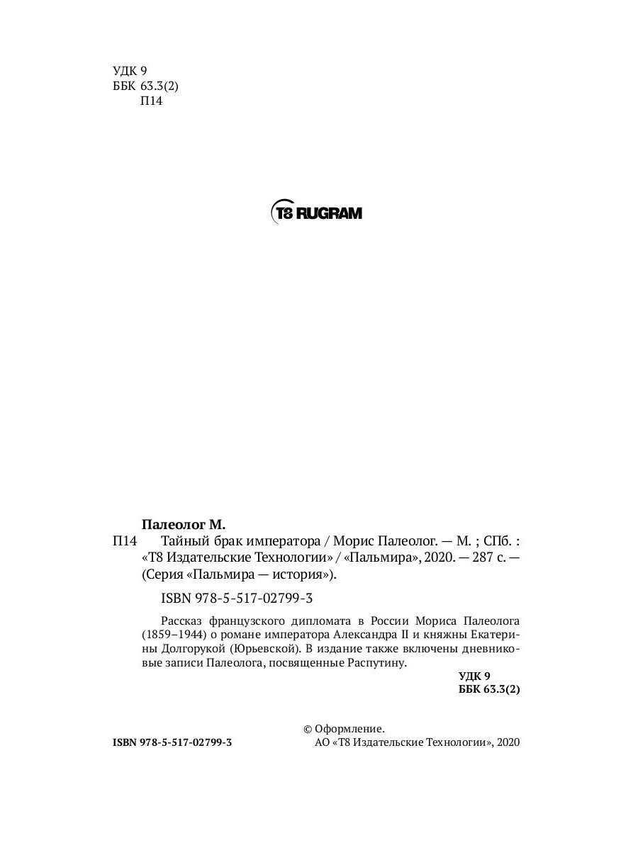 Рассказ французского дипломата в России Мориса Палеолога (1859-1944) о романе императора Александра II и княжны Екатерины Долгорукой (Юрьевской). В издание также включены дневниковые записи Палеолога, посвященные Распутину.| Издательство | Т8 RUGRAM |