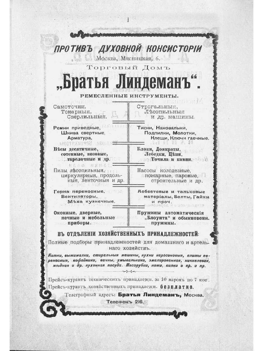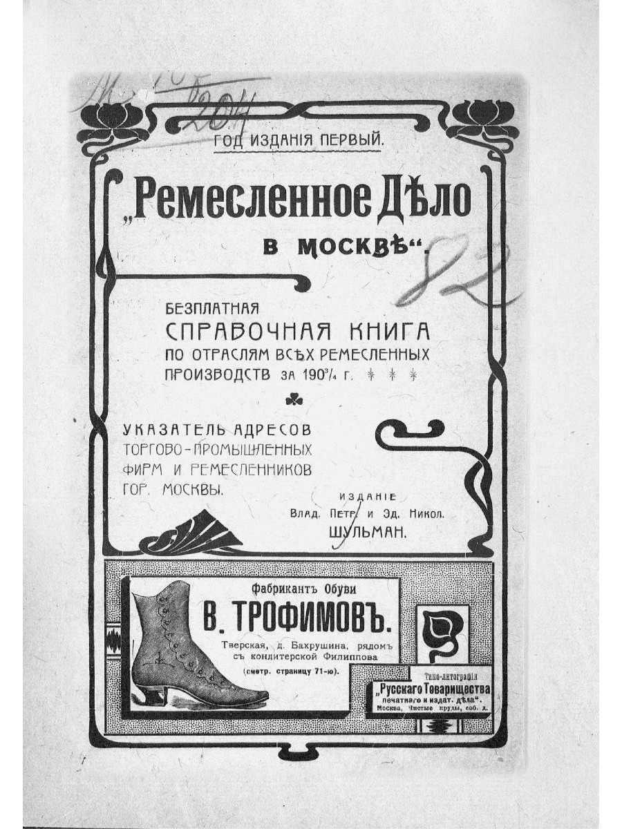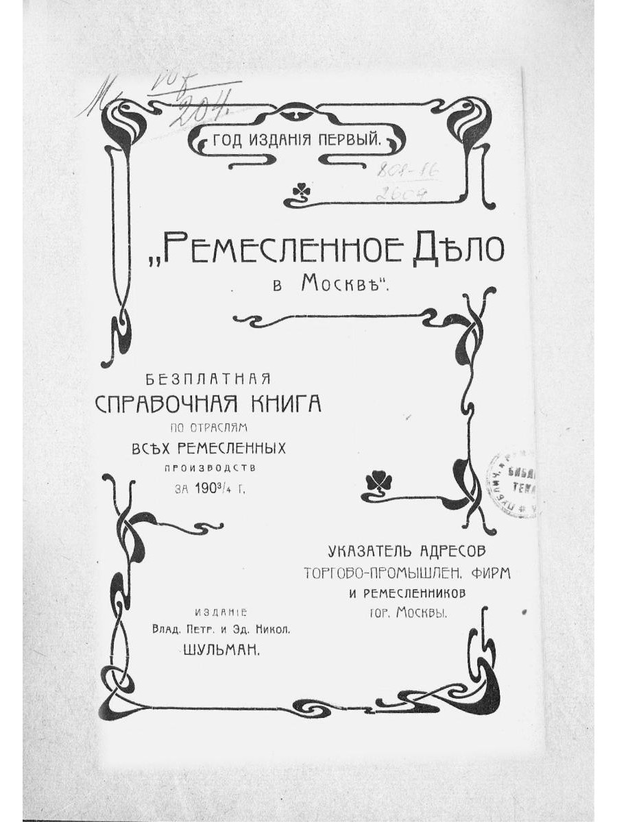 Бесплатная справочная книга по отраслям всех ремесленных производств за 1903-1904 гг. Указатель адресов торгово-промышленных фирм и ремесленников г. Москвы.