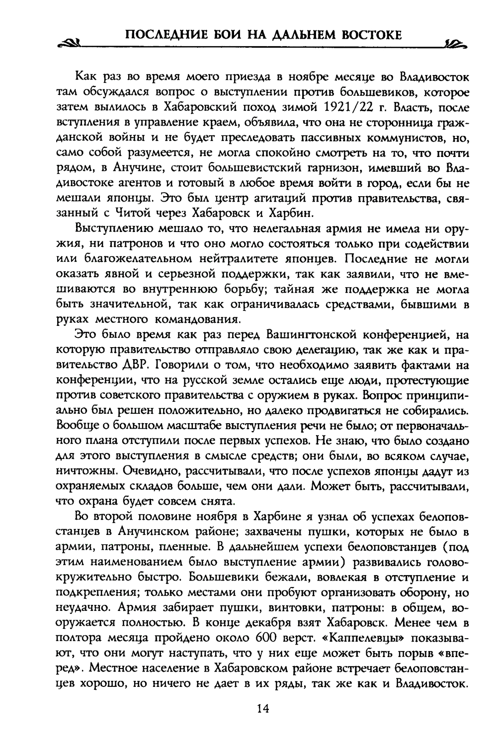 Книга представляет собой 24-й том из серии, посвященной Белому движению в России, и знакомит с заключительным этапом Гражданской войны на территории исторической России - боям и политической обстановке в 1921-1922 гг. в Приморье. Подробно описан так называемый Хабаровский поход, взятие Хабаровска и отступление. Несомненный интерес представляют воспоминания участников тех событий, связанных с созывом Приамурского Земского собора, деятельностью генерала М.К. Дитерихса, эвакуацией армии в Китай. Книга снабжена обширными и впервые публикуемыми комментариями, содержащими несколько сот неизвестных биографических справок об авторах и героях очерков.| Издательство | Центрполиграф |