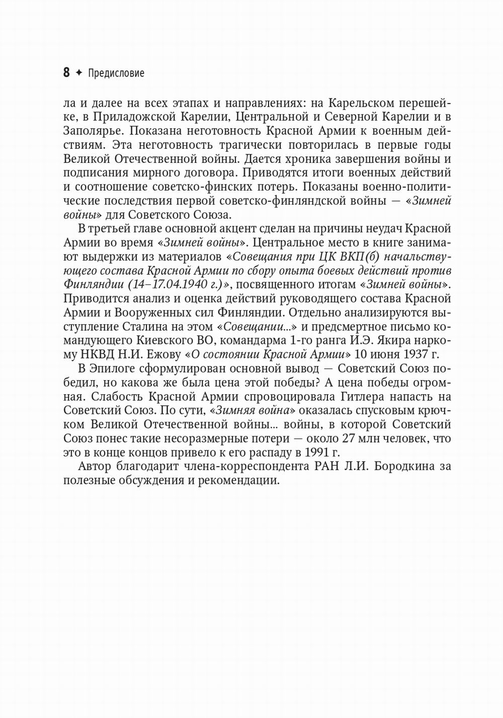 В книге отражены события, предшествующие Советско-финляндской войне (30.11.1939-13.03.1940 гг.) - "Зимней войне", советско-финские отношения накануне войны, подготовка Советского Союза и Финляндии к вой не, состояние противоборствующих сил, дается сравнительная характеристика высшего командования Красной Армии и Вооруженных сил Финляндии. Рассмотрены ход военных действий, соотношение советских и финских потерь, территориальные и экономические приобретения Советского Союза за счет Финляндии по итогам Московского мирного договора от 12.03.1940 г., а также военно-политические последствия этой войны для Советского Союза. Показано, что "Зимняя война" продемонстрировала всему миру неготовность, слабость Красной Армии, в первую очередь командиров всех уровней, что спровоцировало Гитлера напасть на Советский Союз 22 июня 1941 года. Подробно анализируются причины неудач Красной Армии по материалам совещания при ЦК ВКП(б) начальствующего состава Красной Армии по сбору опыта боевых действий против Финляндии (14-17.04.1940 г.). В эпилоге сформулирован ответ на основной вопрос - Советский Союз победил, но какова же была цена этой победы? Книга предназначена для широкого круга читателей: историков, военных, студентов различных специальностей, потомков участников "Зимней войны" и Великой Отечественной...| Издательство | ЛитТерра |