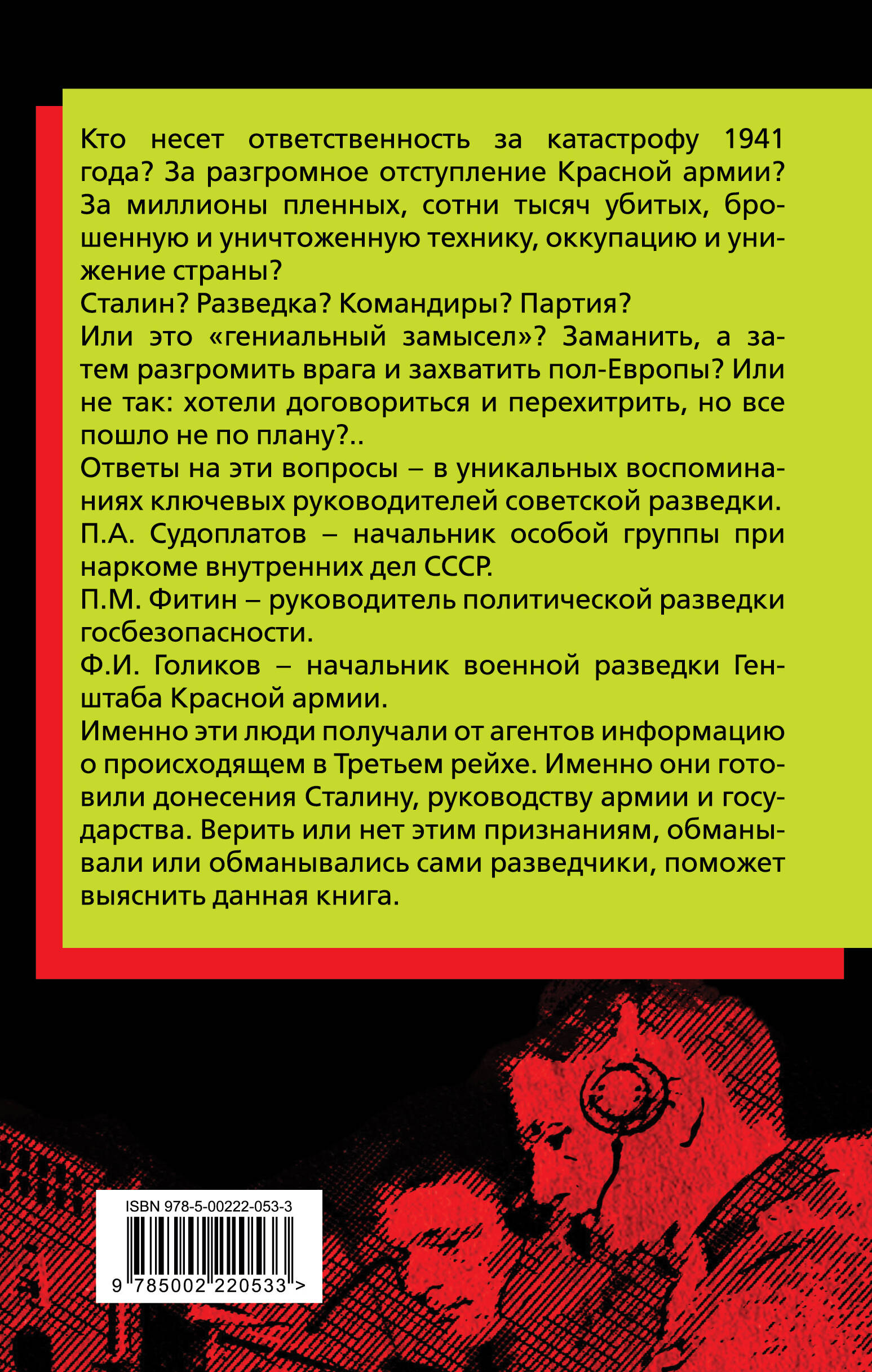 Кто несет ответственность за катастрофу 1941 года? За разгромное отступление Красной Армии. За миллионы пленных, сотни тысяч убитых, брошенную и уничтоженную технику, оккупацию и унижение страны. Сталин? Разведка? Командиры? Партия? Или это «гениальный замысел»? Заманить, а затем разгромить врага и захватить пол-Европы? Или не так: хотели договориться и перехитрить, но все пошло не по плану?.. Ответы на эти вопросы в уникальных воспоминаниях ключевых руководителей советской разведки. П.А. Судоплатов - начальник особой группы при наркоме внутренних дел СССР. П.М. Фитин - руководитель политической разведки госбезопасности. Ф.И. Голиков - начальник военной разведки Генштаба Красной Армии. Именно эти люди получали от агентов информацию о происходящем в Третьем Рейхе. Именно они готовили донесения Сталину, руководству армии и государства. Верить или нет этим признаниям, обманывали или обманывались сами разведчики, поможет выяснить данная книга.| Издательство | Родина Издательство ООО |