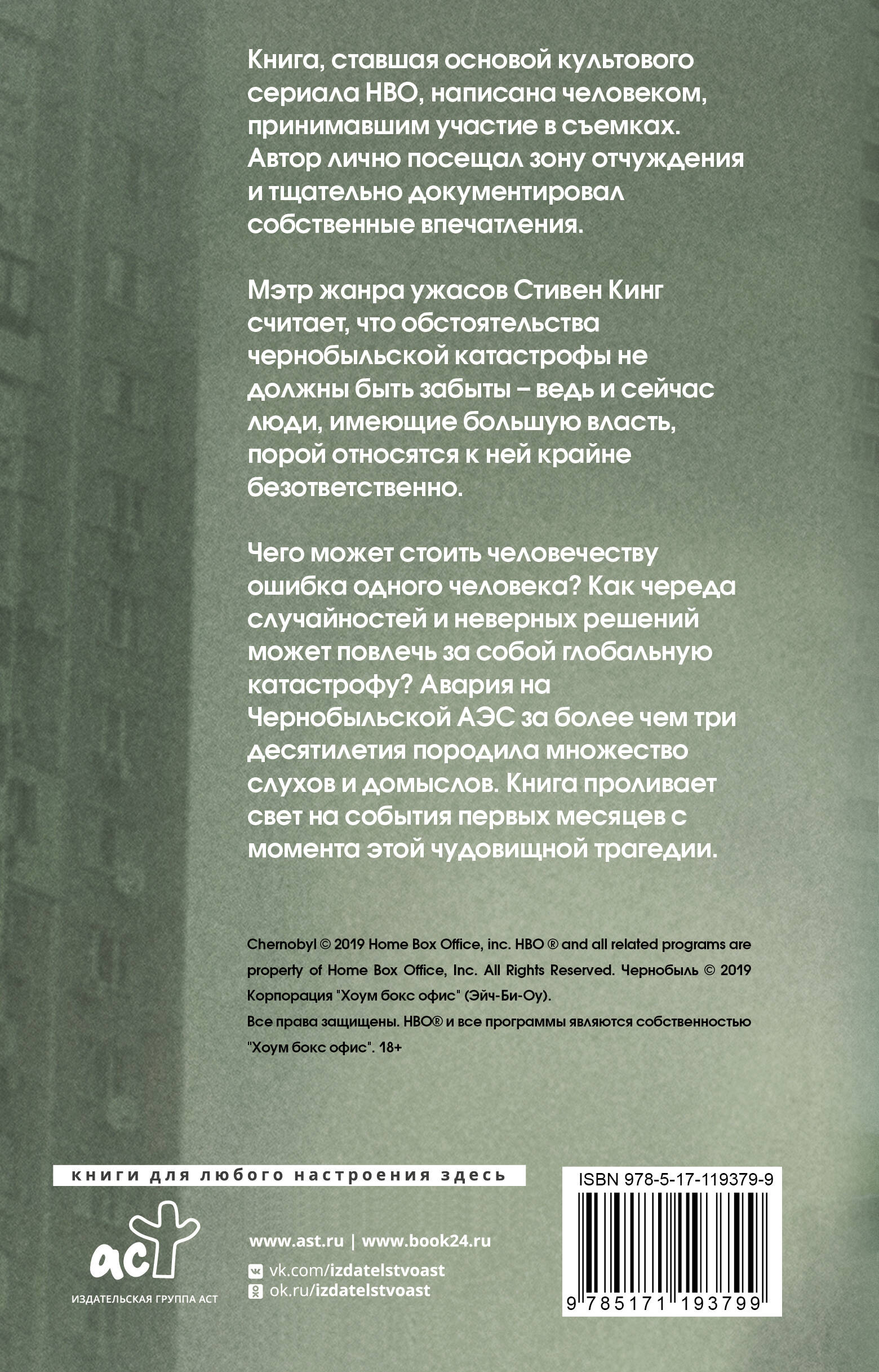 Книга, ставшая основой культового сериала НВО, написана человеком, принимавшим участие в съемках. Автор лично посещал зону отчуждения и тщательно документировал собственные впечатления. Мэтр жанра ужасов, Стивен Кинг, считает, что обстоятельства чернобыльской катастрофы не должны быть забыты - ведь и сейчас люди, имеющие большую власть, порой относятся к ней крайне безответственно. Чего может стоить человечеству ошибка одного человека? Как череда случайностей и неверных решений может повлечь за собой глобальную катастрофу? Авария на чернобыльской АЭС за более чем три десятилетия породила множество слухов и домыслов. Книга проливает свет на события первых месяцев с момента этой чудовищной трагедии.| Издательство | ИЗДАТЕЛЬСТВО "АСТ" |