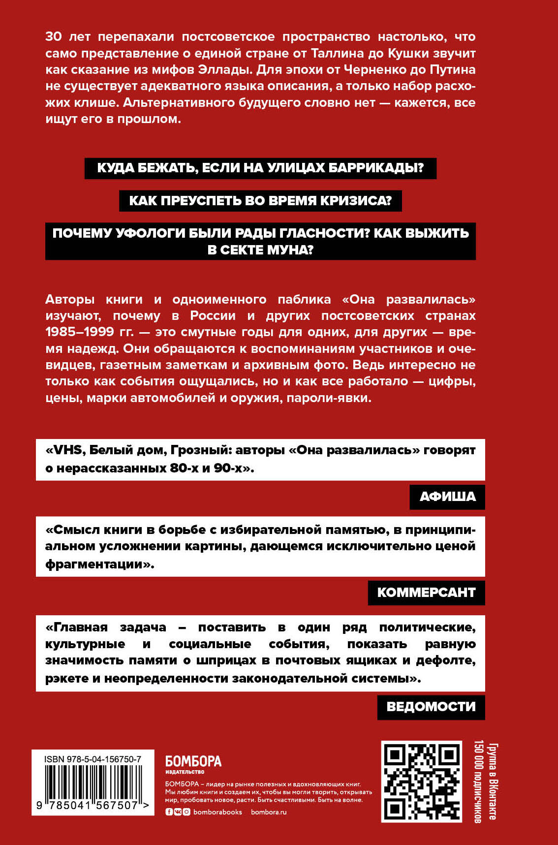 Долгожданное переиздание первой части популярного сборника на основе материала из паблика ВКонтакте с аудиторией более 150 000 человек «Она развалилась»! Вторая часть «Они отвалились. Как и почему закончился социализм в Восточной Европе» вошла в лонг-лист премии «Просветитель», самой престижной премии в области научно-популярной литературы! Эта книга представляет собой увлекательную экскурсию по частной памяти самых разных людей об истории нашей страны с 1985 по 1999 год. В ней вы узнаете: - о рабочем движении в СССР и постсоветской России, - о зарождении репрессивных механизмов в современной России, - о президентских выборах 1996 года, - о сообществах экологов, толкиенистов, последователях святого Муна и уфологов, - о трансформации русского рока и многом другом. Издание предназначено широкому кругу читателей: оно подойдет как ученым-историкам, так и тем, кто только начинает свое знакомство с этим периодом или желает дополнить свои воспоминания об этом времени. «Главная задача - поставить в один ряд политические, культурные и социальные события, показать равную значимость памяти о шприцах в почтовых ящиках и дефолте, рэкете и неопределенности законодательной системы». - «Ведомости» «"Она развалилась" не сводится к преодолению стереотипных воззрений на девяностые годы. В ней воскрешаются многие забытые реалии тогдашней жизни». - «Историческая экспертиза»| Издательство | ООО "Издательство "Эксмо" |