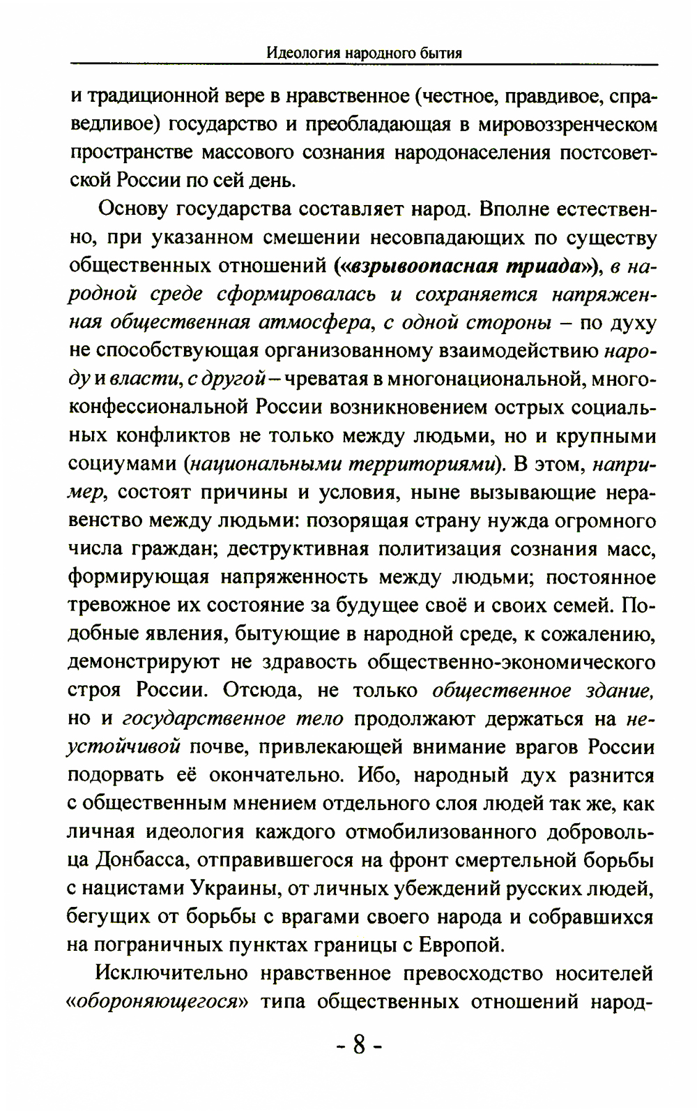 Изложенные автором размышления не претендуют на построение развернутой системы категорий о природе и содержании идеологии народного бытия как интеллектуальном движении. В исследовании социального и психоэмоционального состояния атмосферы российского общества в 90-х годах XX века, в ходе осуществления режимом ельцинщины в нашей стране ущербной монетаристской модели «роста», автор использует метод духовно-практического осознания общественного сознания {обыденного, обычного, повседневного), соотносимого с фактами реальной жизни («здесь и сейчас»), не отделенного от неё частоколом абстракций, понятий, категорий. Автор анализирует идейно-нравственный практический опыт разносторонней деятельности многонационального народа России после гибели СССР. Книга предназначена для широкого круга читателей.| Издательство | Книжный мир |