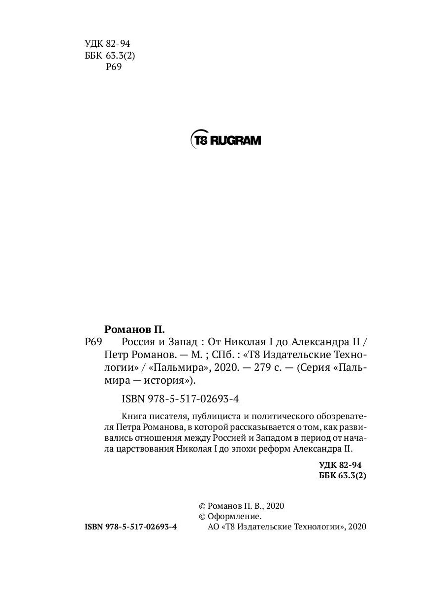 Книга писателя, публициста и политического обозревателя Петра Романова, в которой рассказывается о том, как развивались отношения между Россией и Западом в период от начала царствования Николая I до эпохи реформ Александра II.| Издательство | Т8 RUGRAM |