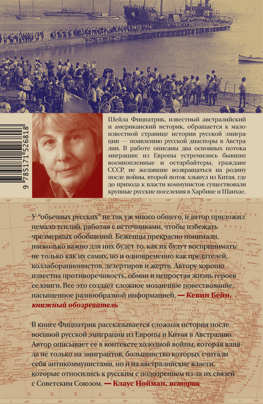 Книга "Белые русские - красная угроза?" Шейлы Фицпатрик, знаменитого ученого-советолога, посвящена малоизвестному историческому сюжету: миграции более 20 000 русских в Австралию после Второй мировой войны. Их путь был сложным и драматичным: первая волна рабочих прибыла из Китая, вторая волна состояла преимущественно из бывших военнопленных, остарбайтеров, отказавшихся возвращаться в СССР. Многие из мигрантов скрывали свою национальность и пользовались поддельными документами, чтобы избежать попыток советской власти репатриировать их. Шейла Фицпатрик, опираясь на архивные данные и свои обширные познания в советской истории, подробно описывает существование русской диаспоры в Австралии. В книге также освещается сложная система слежки и взаимодействия австралийских и советских спецслужб, а также их влияние на разобщенное мигрантское сообщество: многие из приезжих были антикоммунистами, но были и те, кто поддерживал советский режим и мечтал вернуться на родину.| Издательство | Издательство "АСТ" |