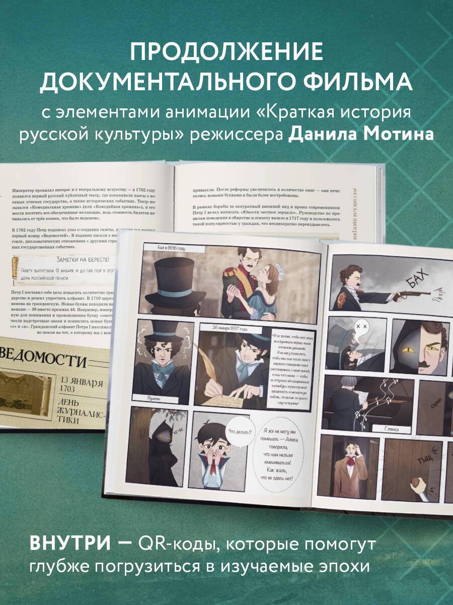 Уникальная интерактивная книга «Краткая история русской культуры» станет идеальным подарком каждому школьнику! Увлекательный рассказ, красочные иллюстрации, наглядная инфографика и захватывающий комикс понравятся каждому! Коля и Алиса - обычные школьники XXII века. Они все так же не любят зубрить учебники и иногда нарушают правила. Ребята решили немного схитрить при подготовке к экзамену по истории и вместо скучной зубрежки пройти запрещенную в прошлом веке игру. Она проведет их сквозь века русской культуры и познакомит со всеми важными событиями. Читателей книги ждет захватывающее путешествие сквозь 10 столетий русской истории вместе с героями от Древней Руси до наших дней. Главные культурные события каждой эпохи, пересказы самых важных книг и фильмов сопровождены комиксом, который поможет удержать внимание ребенка в изучении объемной и важной темы. Весной 2023 года фильм «Краткая история русской культуры» вышел в широкий прокат в сети Фонда Кино и МосКино. В 2022 г. фильм стал одним из 35 победителей конкурса в рамках всероссийского просветительского проекта Знание.Кино Российского общества «Знание» и получил поддержку Института развития интернета (АНО «ИРИ»). Онлайн фильм можно посмотреть в онлайн-кинотеатре Okko, аудиоверсия фильма доступна эксклюзивно в HiFi-стриминге Звук.| Издательство | ООО "Издательство "Эксмо" |