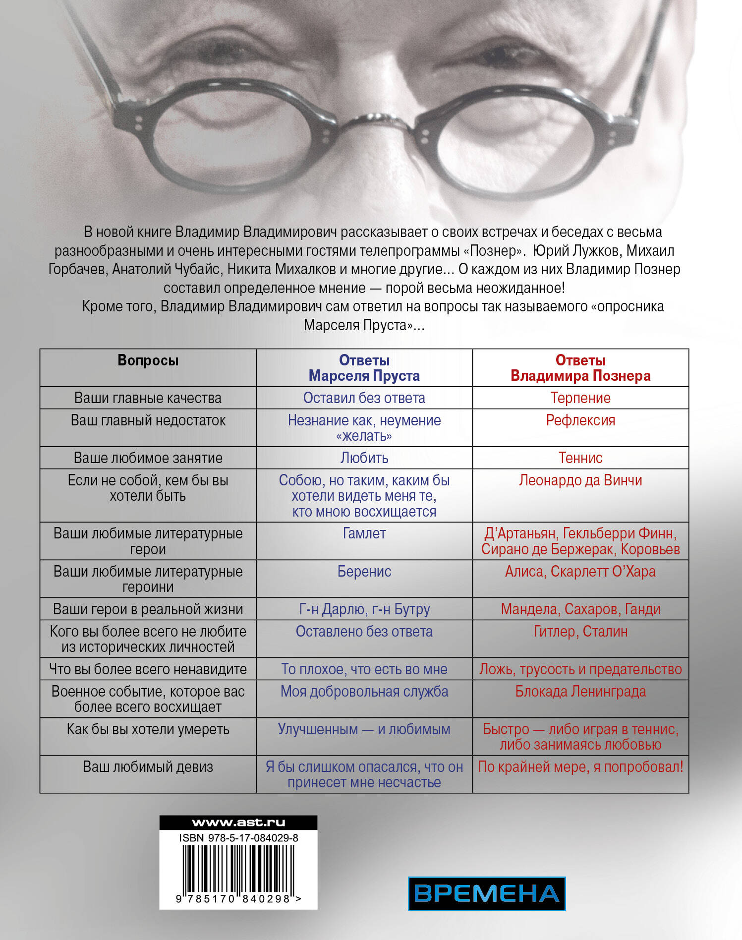 В своей новой книге Владимир Владимирович рассказывает о своих встречах и беседах с весьма разнообразными и очень интересными гостями телепрограммы "Познер". Юрий Лужков, Михаил Горбачев, Анатолий Чубайс, Никита Михалков и многие другие… О каждом из них Владимир Познер составил определенное мнение - порой весьма неожиданное! Кроме того, Владимир Владимирович сам ответил на вопросы так называемого "опросника Марселя Пруста"…| Издательство | ИЗДАТЕЛЬСТВО "АСТ" |