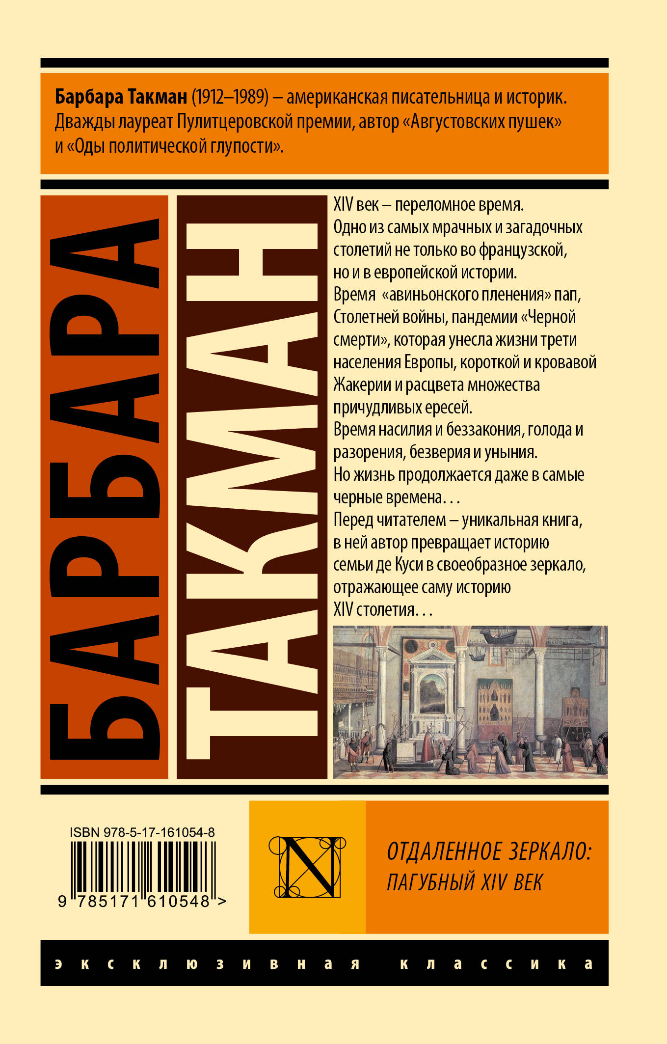 Барбара Такман (1912-1989) - американская писательница и историк. Дважды лауреат Пулитцеровской премии, автор "Августовских пушек" и "Оды политической глупости". XIV век - переломное время. Одно из самых мрачных и загадочных столетий не только во французской, но и в европейской истории. Время "авиньонского пленения" пап, Столетней войны, пандемии "Черной смерти", которая унесла жизни трети населения Европы, короткой и кровавой Жакерии и расцвета множества причудливых ересей. Время насилия и беззакония, голода и разорения, безверия и уныния. Но жизнь продолжается даже в самые черные времена… Перед читателем - уникальная книга, в ней автор превращает историю семьи де Куси в своеобразное зеркало, отражающее саму историю XIV столетия…| Издательство | Издательство "АСТ" |