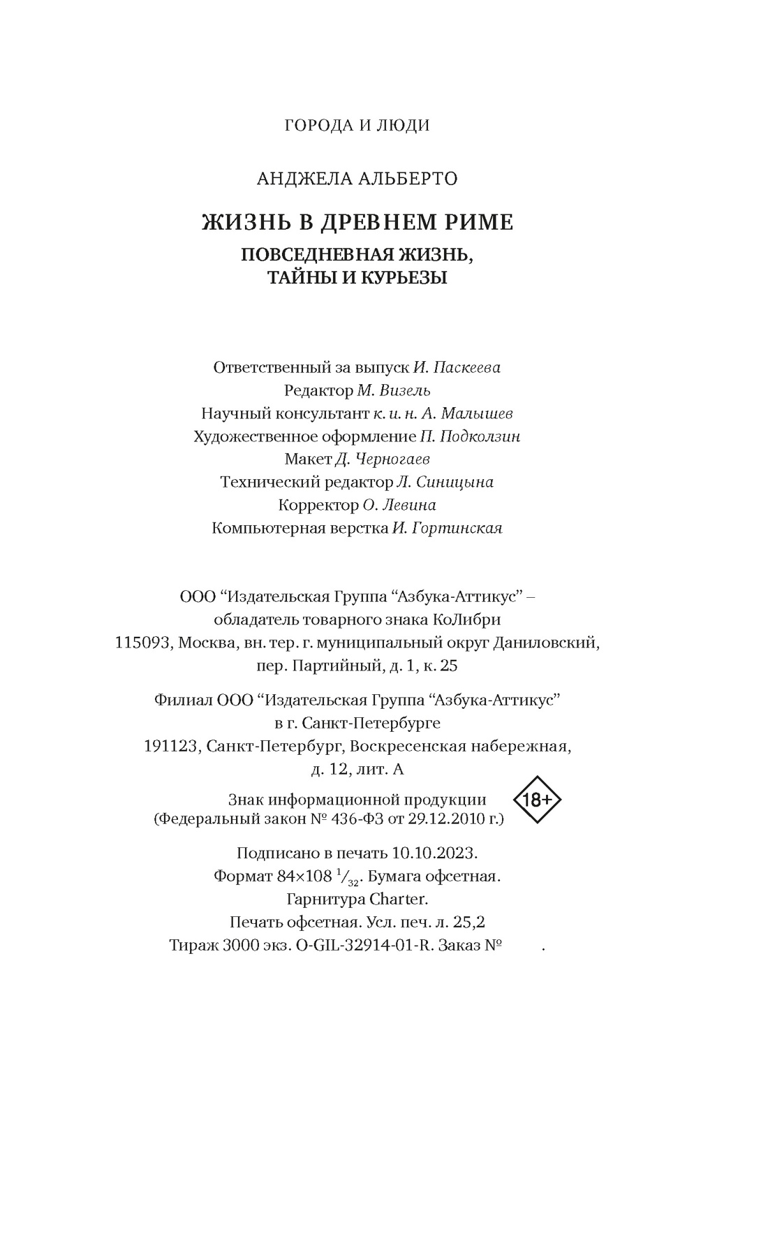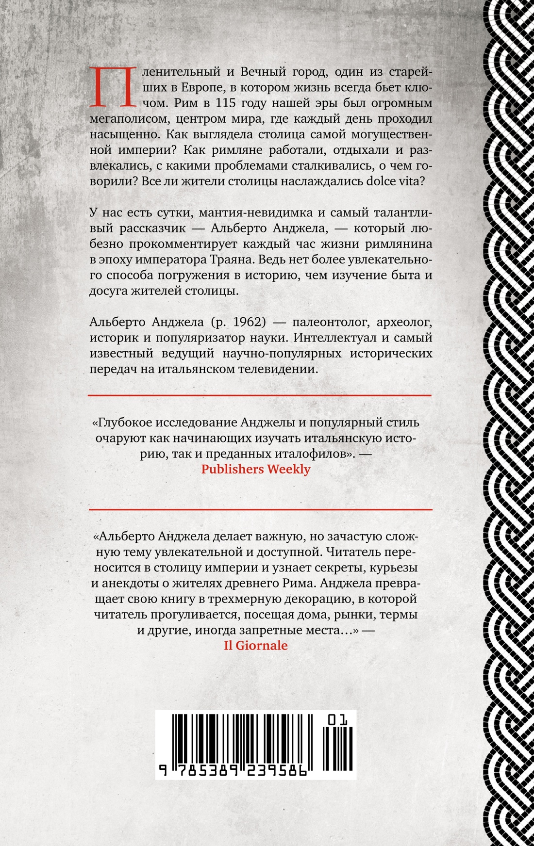 Древний Рим времен расцвета империи похож на современный мега- полис гораздо больше, чем мы могли бы подумать. Полтора миллиона его жителей сталкивались с теми же проблемами, что и их наследники две тысячи лет спустя: дороговизна жилья и дорожные пробки, наплыв иммигрантов и необходимость "подмазывать" городских чиновников… Автор предлагает нам "накрыться шапкой-невидимкой" и провести в Риме целый день, от рассвета до заката, в 115 году нашей эры: потолкаться на людной улице и заглянуть в Колизей, посетить судебное слушание и роскошные термы, отведать изысканных блюд и насладиться беседой на званом ужине. И закончить день на любовном ложе - здесь тоже за две тысячи лет ничего не изменилось.| Издательство | КоЛибри |