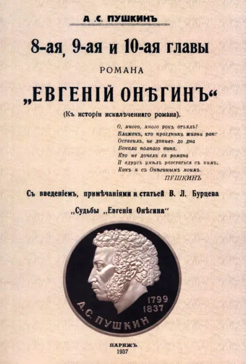 Репринт с издания. Париж, 1937. Довольно спорная трактовка автора содержания последних глав Евгения Онегина, сопровождаемая ссылками на источники. Эта книга будет весьма любопытна всем любителям этого романа. Владимир Львович Бурцев (1862 - 1942, Париж) - русский публицист и издатель (журнал "Былое" и др.), заслуживший за свои разоблачения секретных сотрудников Департамента полиции ("провокаторов царской охранки") Азефа, Гернгросс-Жученко, Гартинга, Серебряковой и других прозвище "Шерлока Холмса русской революции". Этим же он занимался в эмиграции - разоблачая агентов ГПУ. Изданные нами книги Бурцева: 1. Как Пушкин хотел издать "Евгения Онегина" и как издал. - Париж, 1934. 2. Восьмая, девятая и десятая главы романа "Евгений Онегин". - Париж, 1937. 3. Большевицкие гангстеры в Париже: похищение генерала Миллера и генерала Кутепова. - Париж, 1939. 4. За сто лет 1800-1896. Сборник из истории политических и общественных движений в России.- Лондон, 1897. Тираж 30 экз. выполнен по технологии print-on-demand.