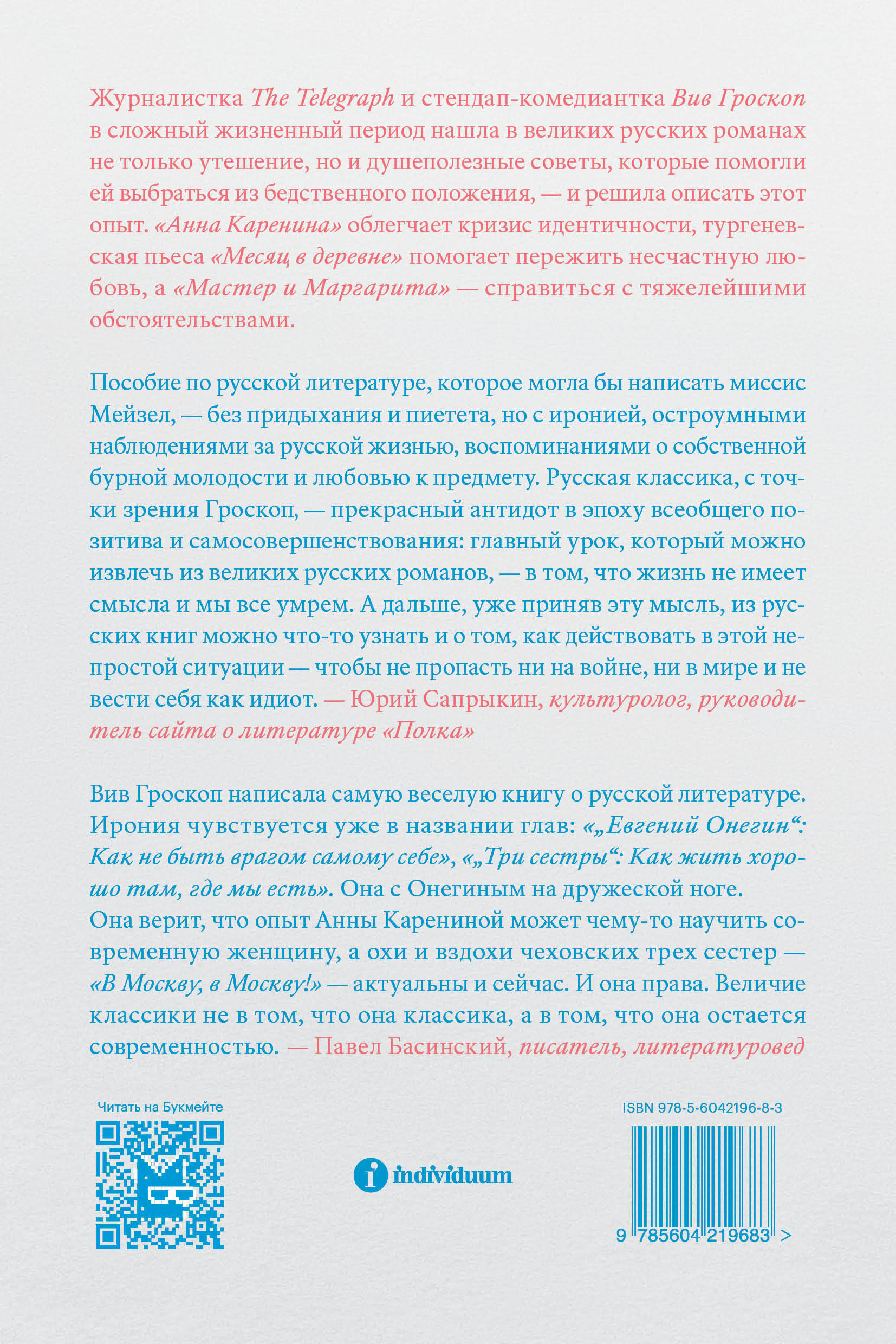 Журналистка The Telegraph и профессиональная стендап-комедиантка Вив Гроскоп в сложный жизненный период нашла в великих русских романах не только утешение, но и душеполезные советы, которые помогли ей выбраться из бедственного положения - и решила описать этот опыт. В «Саморазвитии по Толстому» она на собственном примере и судьбах русских классиков показывает, что даже из самой сложной ситуации можно найти выход с помощью литературы: «Анна Каренина» облегчает кризис идентичности, тургеневская пьеса «Месяц в деревне» помогает пережить несчастную любовь, а «Мастер и Маргарита» - справиться с тяжелейшими обстоятельствами. Лев Толстой, Федор Достоевский, Анна Ахматова, Антон Чехов, Николай Гоголь и другие в книге Гроскоп - не бронзовые памятники, а живые люди, которые тоже страдали и сомневались, их обуревали тысячи страстей, но они сумели сохранить достоинство и остались самими собой. «Саморазвитие по Толстому» - занимательная попытка посмотреть со стороны на сюжеты, знакомые каждому русскоязычному читателю со школьной скамьи, и понять, почему мы так любим слова «душа» и «судьба».| Издательство | ИНДИВИДУУМ ПРИНТ ООО |