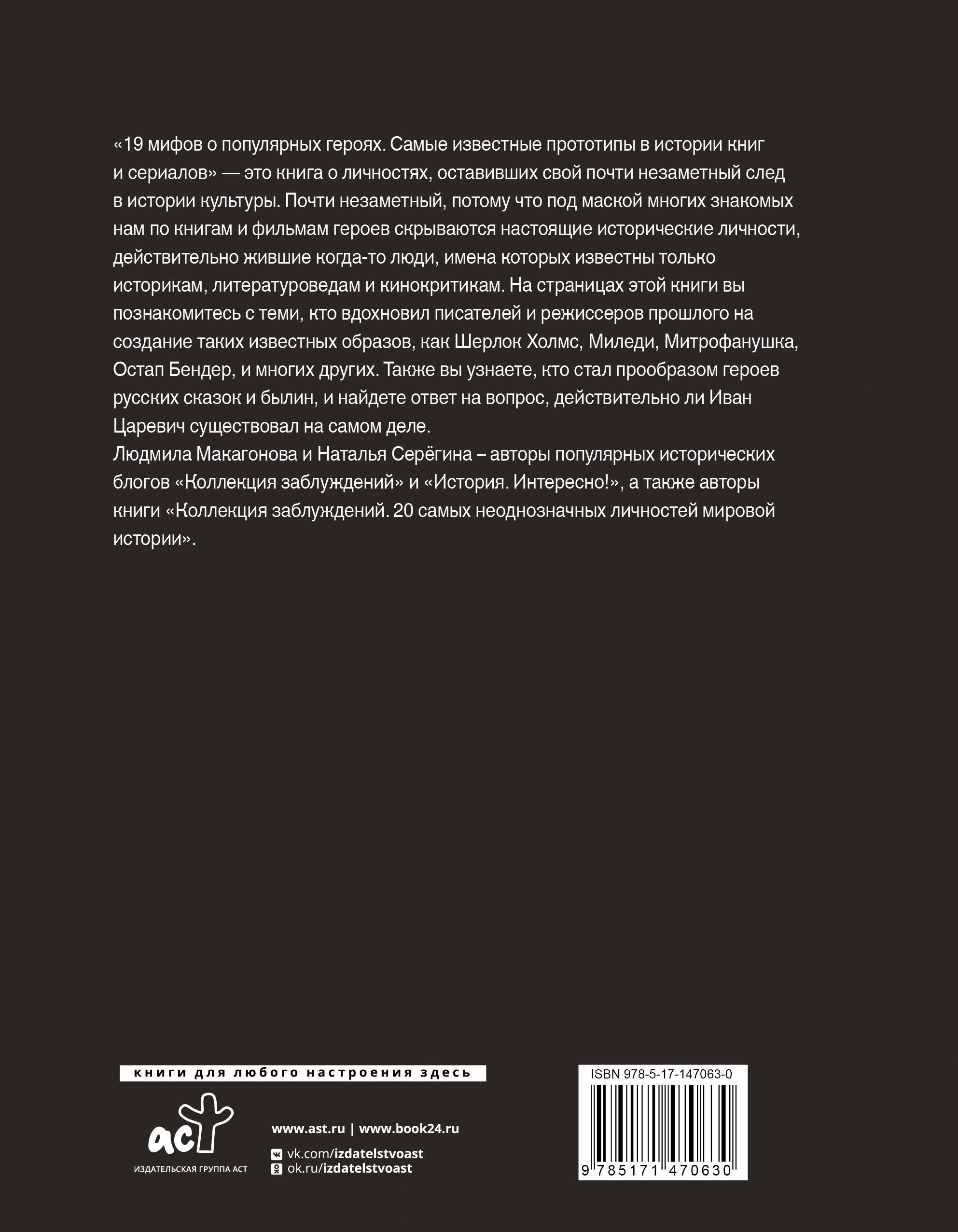 "19 мифов о популярных героях. Самые известные прототипы в истории книг и сериалов" - это книга о личностях, оставивших свой почти незаметный след в истории культуры. Почти незаметный, потому что под маской многих знакомых нам по книгам и фильмам героев скрываются настоящие исторические личности, действительно жившие когда-то люди, имена которых известны только историкам, литературоведам и кинокритикам. На страницах этой книги вы познакомитесь с теми, кто вдохновил писателей и режиссеров прошлого на создание таких известных образов, как Шерлок Холмс,Хюррем, Миледи, Митрофанушка, Остап Бендер и многих других. Также вы узнаете, кто стал прообразом героев русских сказок и былин, и найдете ответ на вопрос, действительно ли Иван Царевич существовал на самом деле. Людмила Макагонова и Наталья Серёгина - авторы популярных исторических блогов "Коллекция заблуждений" и "История. Интересно!", а также авторы книги "Коллекция заблуждений. 20 самых неоднозначных личностей мировой истории".| Издательство | ИЗДАТЕЛЬСТВО "АСТ" |