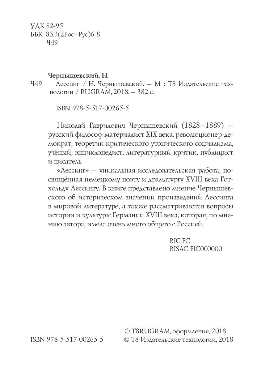 Николай Гаврилович Чернышевский (1828-1889) - русский философ-материалист XIX века, революционер-демократ, теоретик критического утопического социализма, учёный, энциклопедист, литературный критик, публицист и писатель. «Лессинг» - уникальная исследовательская работа, посвященная немецкому поэту и драматургу XVIII века Готхольду Лессингу. В книге представлено мнение Чернышевского об историческом значении произведений Лессинга в мировой литературе, а также рассматриваются вопросы истории и культуры Германии XVIII века, которая, по мнению автора, имела очень много общего с Россией.| Издательство | Т8 RUGRAM |