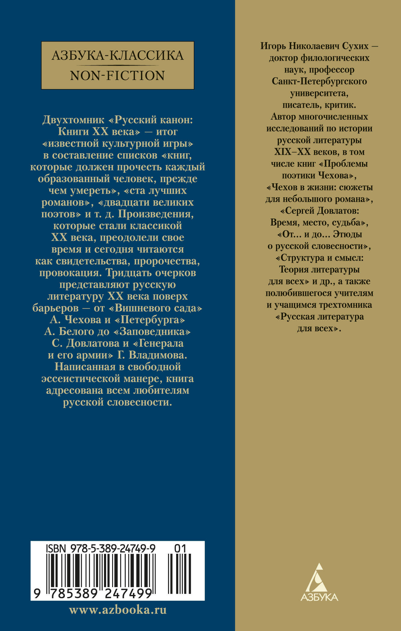 Игорь Николаевич Сухих - доктор филологических наук, профессор Санкт-Петербургского университета, писатель, критик. Автор многочисленных исследований по истории русской литературы XIX-XX веков, в том числе книг "Проблемы поэтики Чехова", "Чехов в жизни: сюжеты для небольшого романа", "Сергей Довлатов: Время, место, судьба", "От… и до… Этюды о русской словесности", "Структура и смысл: Теория литературы для всех" и др., а также полюбившегося учителям и учащимся трехтомника "Русская литература для всех". Двухтомник "Русский канон: Книги ХХ века" - итог "известной культурной игры" в составление списков "книг, которые должен прочесть каждый образованный человек, прежде чем умереть", "ста лучших романов", "двадцати великих поэтов" и т. д. Произведения, которые стали классикой ХХ века, преодолели свое время и сегодня читаются как свидетельства, пророчества, провокация. Тридцать очерков представляют русскую литературу ХХ века поверх барьеров - от "Вишневого сада" А. Чехова и "Петербурга" А. Белого до "Заповедника" С. Довлатова и "Генерала и его армии" Г. Владимова. Написанная в свободной эссеистической манере, книга адресована всем любителям русской словесности.| Издательство | Азбука-Аттикус Издат.группа ООО |
