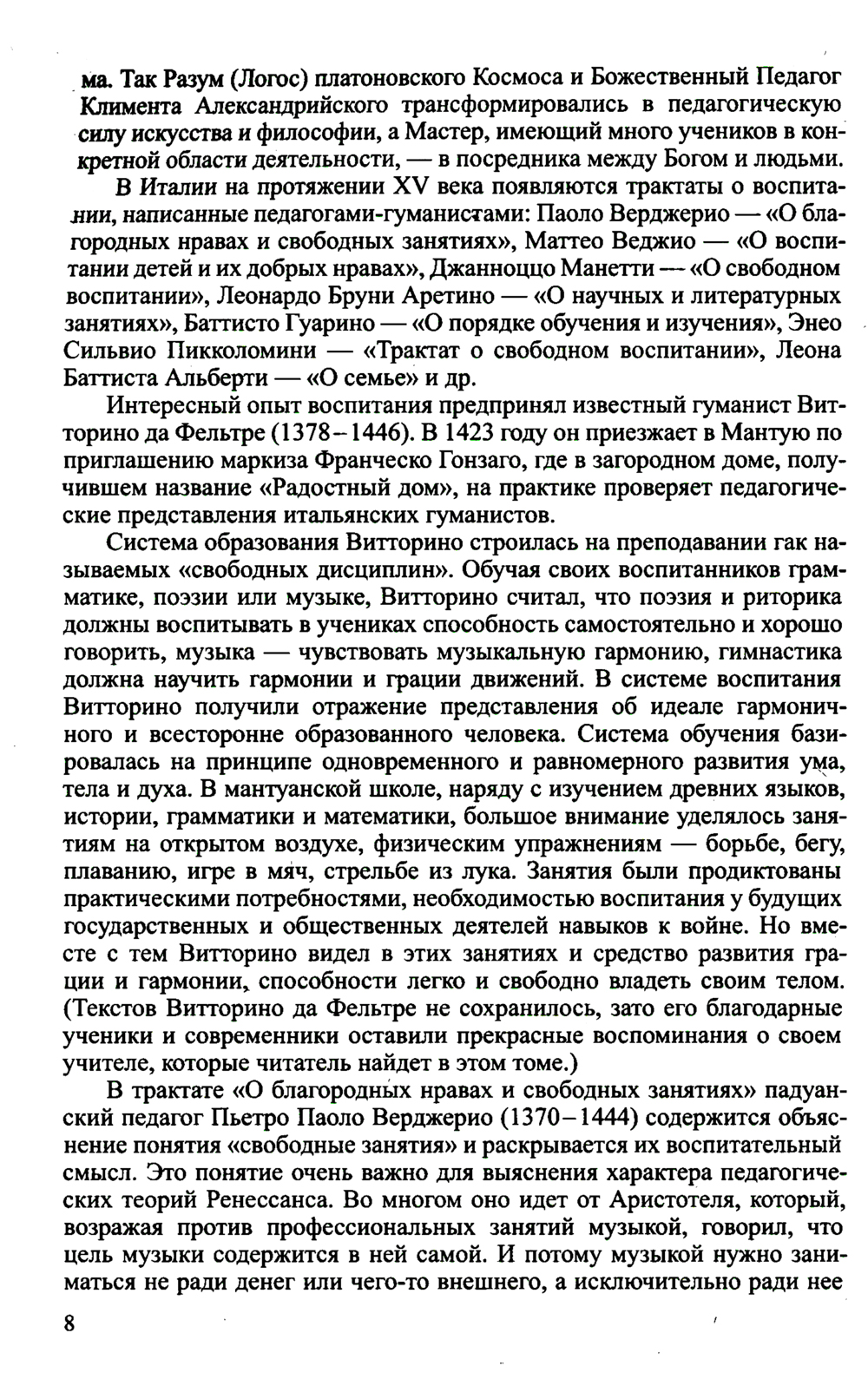 В настоящем сборнике представлены труды по педагогике известных гуманистов и великих мастеров эпохи Возрождения: мыслителя Джованни Пико делла Мирандола (1463-1494), церковного писателя и оратора, папы римского Пия II (1405-1464), известного под светским именем Энеа Сильвио Бартоломео Пикколомини, архитектора Леона Батиста Альберти (1404-1472), монаха-философа Томмазо Кампанеллы (1568-1639) и гениального учёного-живописца Леонардо да Винчи (1452-1519). Ознакомившись с содержанием книги, вы окунётесь в атмосферу эпохи Возрождения с её стремлением к воспитанию целостной, гармоничной личности, свободной от предрассудков и мечтающей стать творцом. Книга может быть полезна широким кругам педагогических работников.| Издательство | Амрита-Русь |