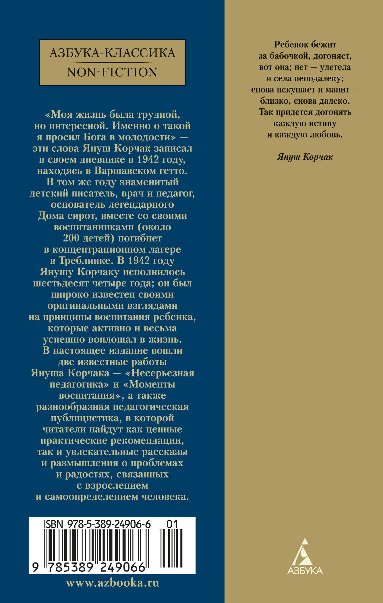 "Моя жизнь была трудной, но интересной. Именно о такой я просил Бога в молодости" - эти слова Януш Корчак записал в своем дневнике в 1942 году, находясь в Варшавском гетто. В том же году знаменитый детский писатель, врач и педагог, основатель легендарного Дома сирот, вместе со своими воспитанниками (около 200 детей) погибнет в концентрационном лагере в Треблинке. В 1942 году Янушу Корчаку исполнилось шестьдесят четыре года; он был широко известен своими оригинальными взглядами на принципы воспитания ребенка, которые активно и весьма успешно воплощал в жизнь. В основе его педагогической системы лежала весьма простая мысль: ребенок - полноценный человек, имеющий право на свои собственные взгляды и на свое отношение к окружающему миру. В настоящее издание вошли две известные работы Януша Корчака - "Несерьезная педагогика" и "Моменты воспитания", а также разнообразная педагогическая публицистика, в которой читатели найдут как ценные практические рекомендации, так и увлекательные рассказы и размышления о проблемах и радостях, связанных с взрослением и самоопределением человека.| Издательство | Азбука-Аттикус Издат.группа ООО |