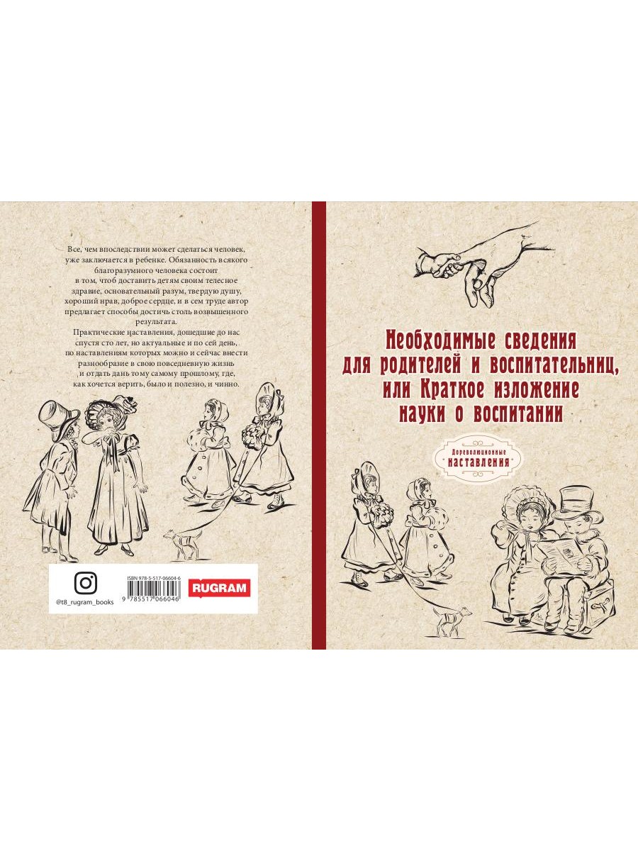 Все, чем впоследствии может сделаться человек, уже заключается в ребенке. Обязанность всякого благоразумного человека состоит в том, чтоб доставить детям своим телесное здравие, основательный разум, твердую душу, хороший нрав, доброе сердце, и в сем труде автор предлагает способы достичь столь возвышенного результата. Практические наставления, дошедшие до нас спустя сто лет, но актуальные и по сей день, по наставлениям которых можно и сейчас внести разнообразие в свою повседневную жизнь и отдать дань тому самому прошлому, где, как хочется верить, было и полезно, и чинно.| Издательство | Т8 RUGRAM |