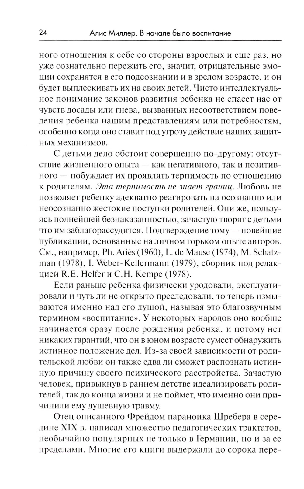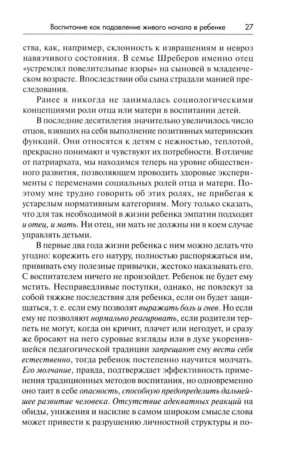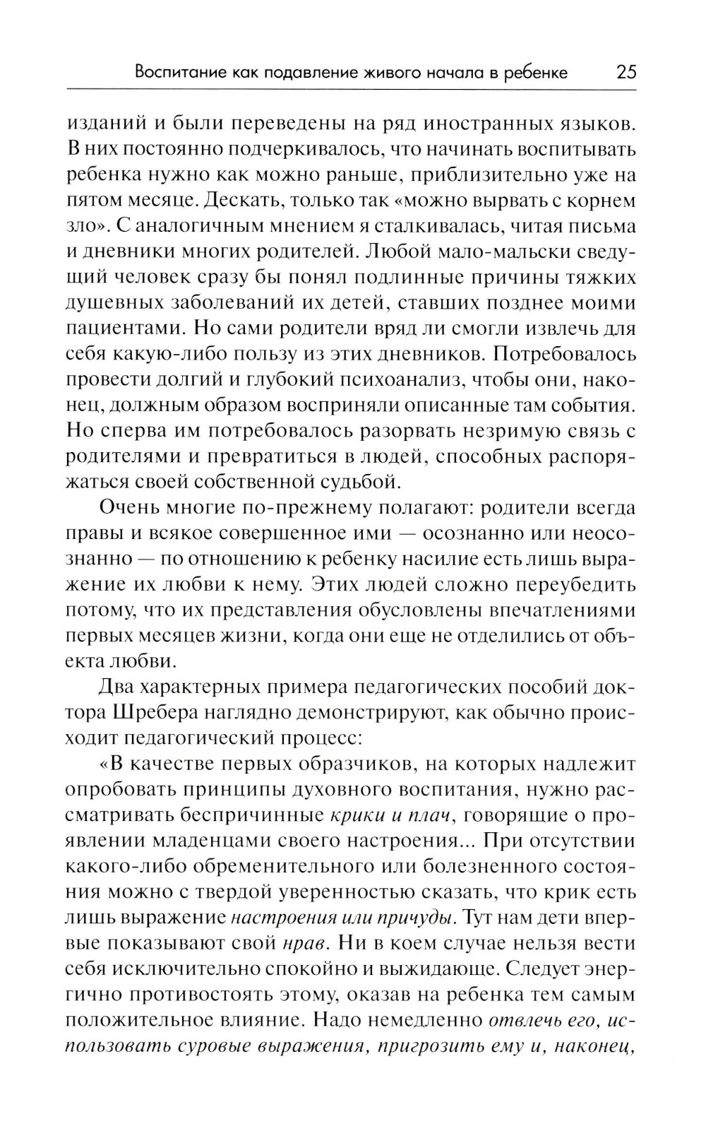 Автор показывает механизмы скрытой жестокости в воспитании детей и корни насилия. Анализируя ряд жизненных историй - пациентки-наркоманки, убийцы малолетних и Адольфа Гитлера, - Миллер раскрывает истоки крайней личностной деструктивности этих людей в их раннем детстве: будучи детьми, они подвергались жестокому обращению и унижению, что и сказалось на их личностных особенностях. Сформулированы основные принципы «черной педагогики» - подавляющего и калечащего ребенка воспитания. Для психологов, психотерапевтов, социальных работников, а также всех, кто интересуется проблемами детства.| Издательство | Академический проект |