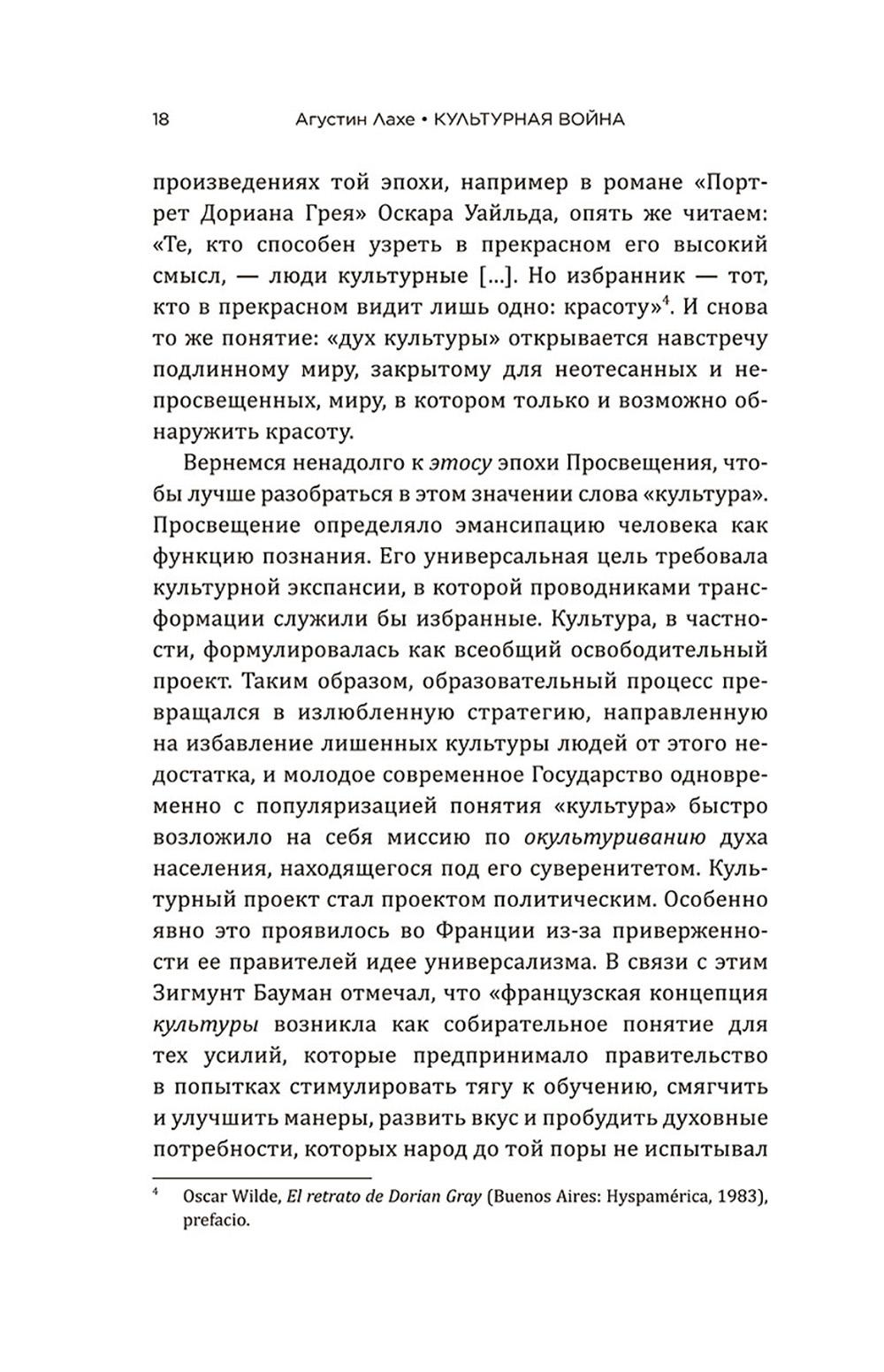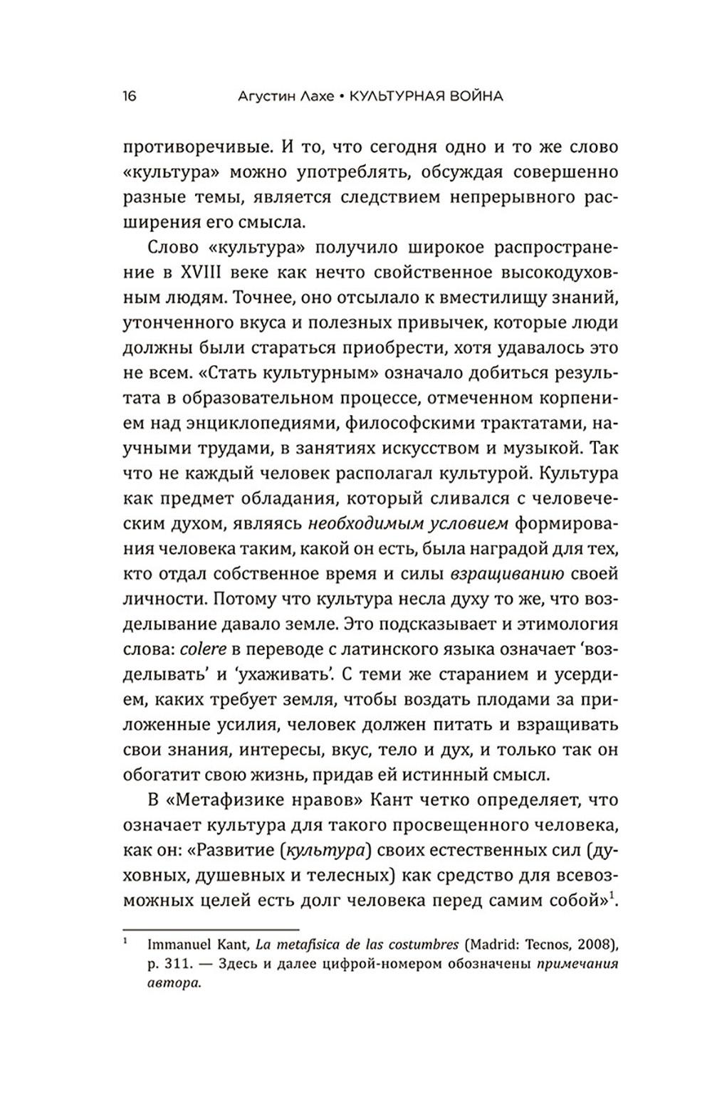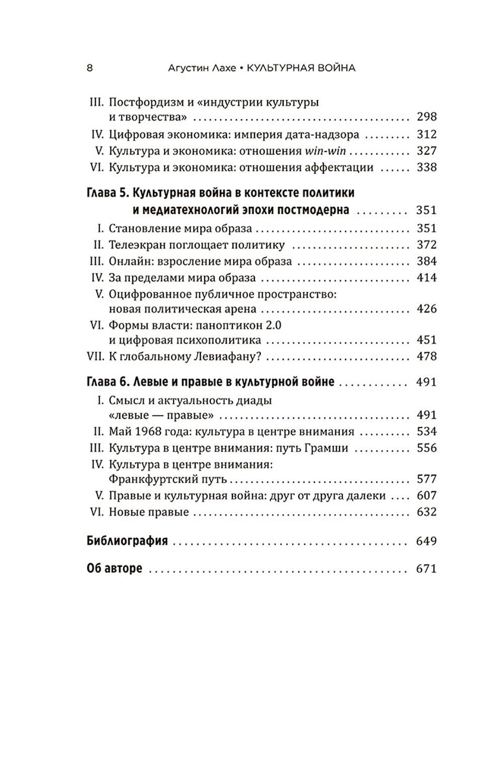 Манифест, который даст пищу для ума «партизанам культуры», воодушевит их и поможет не опускать руки в войне, продолжающей вредить нашим семьям и обществу в целом. В современном мире общество и культура меняются с огромной скоростью. Стремление управлять этими переменами лежит в основе культурных войн, ведущихся сегодня повсеместно. Но что же такое культурная война? Известный писатель, политолог, интеллектуал, знаменитый своими лекциями, Агустин Лахе, опираясь на обширное литературное наследие самых выдающихся историков, социологов, философов и экспертов в области культуры и политики, дает определение понятию культурной войны и показывает, в какой степени культура обрела статус главного трофея власти, как именно зарождались и набирали силу подобные войны, начиная с эпохи модерна и до наступившего в наши дни постмодерна, и как в них выстоять. Параллельно он исследует, насколько хорошо разобрались в сути явления новые левые, в то время как правые недооценивали влияние культуры. Наконец, Лахе предлагает методы и средства, необходимые для рождения новых правых.| Издательство | Попурри |