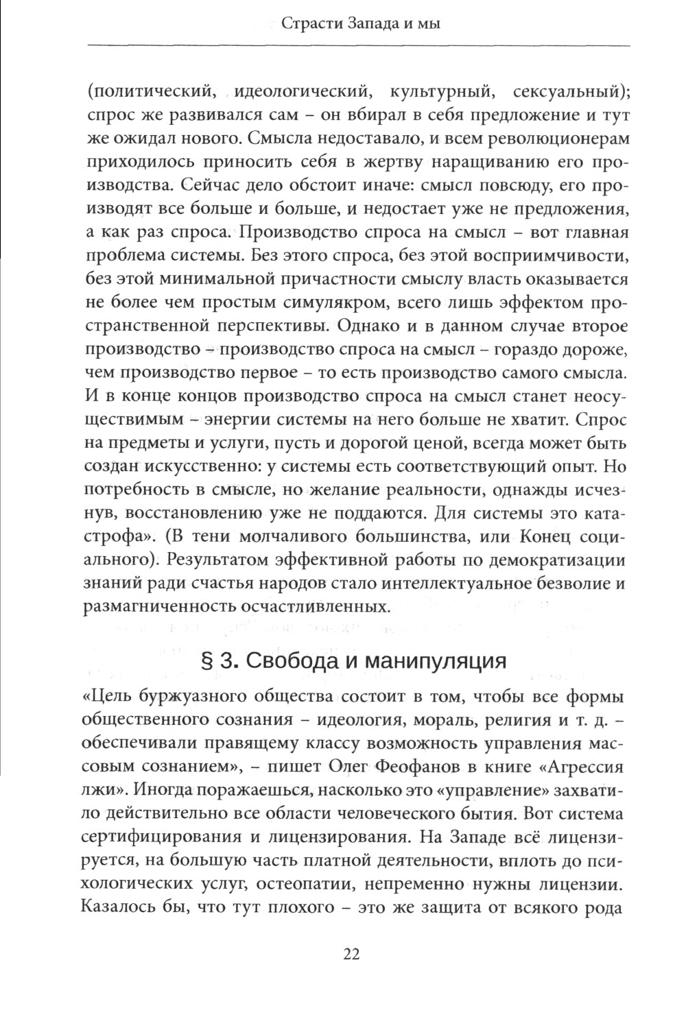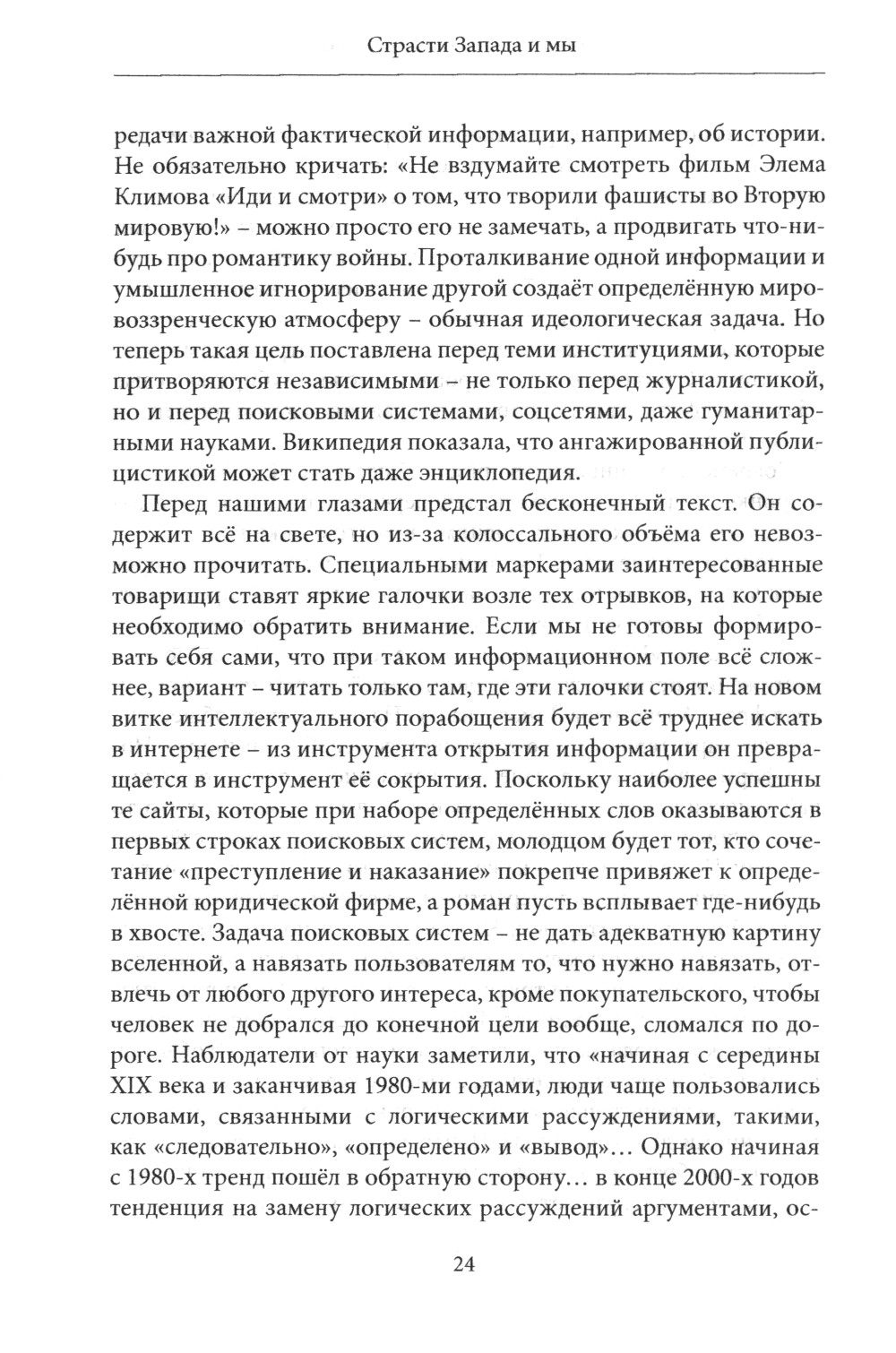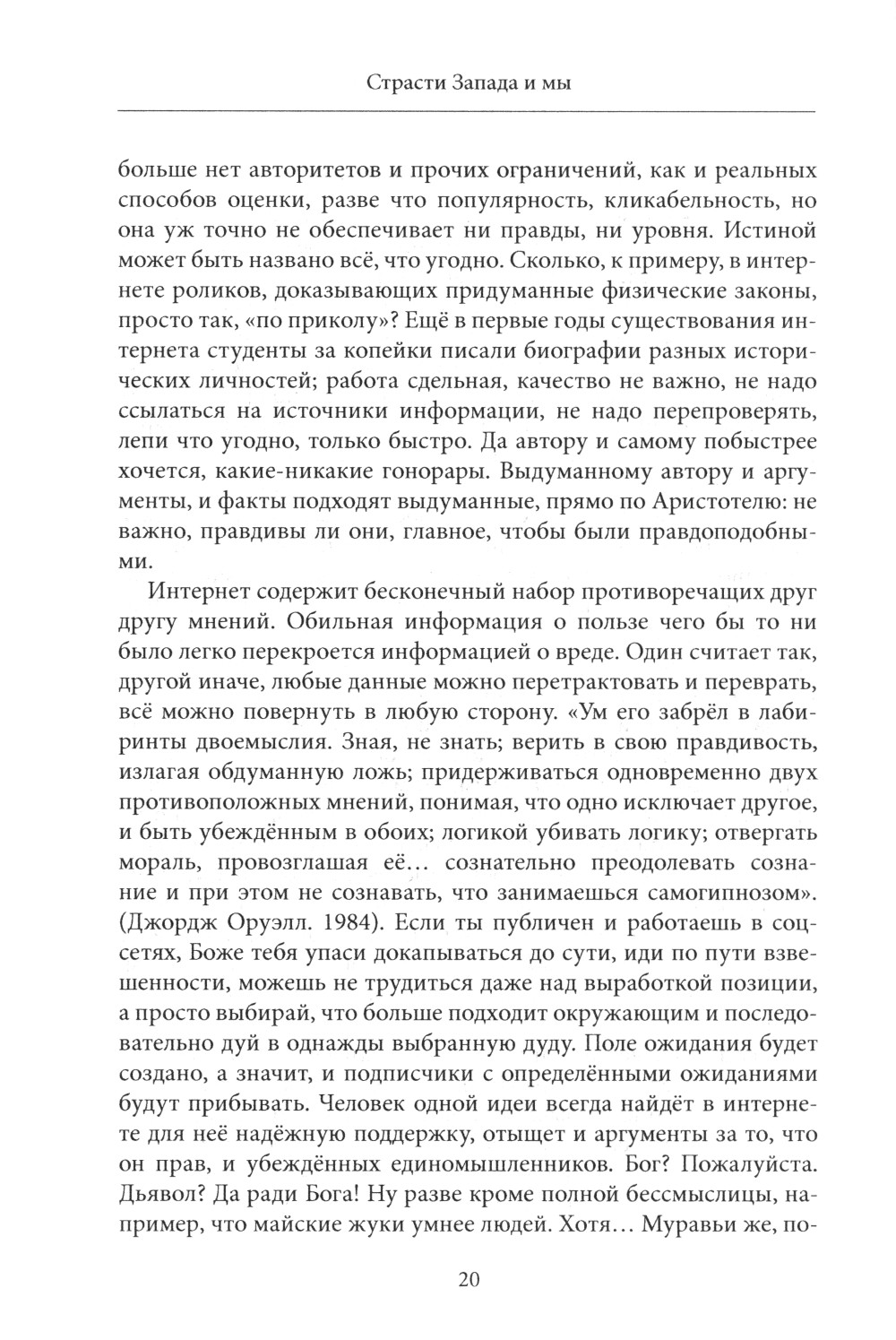 Поддерживаемая гаджетами, старательно подкручиваемая идеологическая машина со своей сложной структурой, опирающейся на тысячи провокаторов и миллионы дурачков, целенаправленно создаёт фальшивые небеса, изготавливает для мира вставное сознание, стараясь не пропустить в него ни посторонних мнений, ни фактов, ни героев. Нам достаточно своих страстей и пороков, чтобы цеплять ещё и соседские, если мы не будем от них дистанцироваться, они тоже станут нашими. Не пора ли стряхнуть с себя пепел пропаганды, перестать принимать пороки за достоинства, а преступления за милые шалости? Не пора ли прекратить свой путь в недозапад, перестать быть полубеременными, немножко святыми, немножко бесноватыми?| Издательство | Институт общегуманитарных исследований (ИОИ) |
