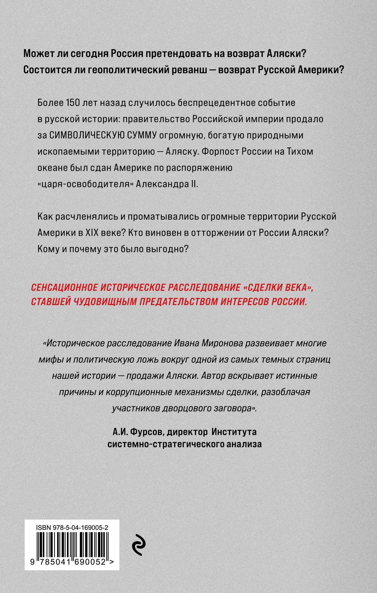 Автор - известный адвокат, автор множества популярных книг. Сидел в тюрьме по обвинению в покушении на А. Чубайса. Был выпущен под поручительство депутатов. Принимает участие во многих ток-шоу. Известен скандальными высказываниями и радикальными взглядами. Может ли сегодня Россия претендовать на возврат Аляски? Состоится ли геополитический реванш - возврат Русской Америки? Более 150 лет назад случилось беспрецедентное событие в русской истории: правительство Российской империи продало за СИМВОЛИЧЕСКУЮ СУММУ огромную, богатую природными ископаемыми территорию - Аляску. Форпост России на Тихом океане был сдан Америке по распоряжению «царя-освободителя» Александра II. Как расчленялись и проматывались огромные территории Русской Америки в XIX веке? Кто виновен в отторжении от России Аляски? Кому и почему это было выгодно? Сенсационное историческое расследование «сделки века», ставшей чудовищным предательством интересов России.| Издательство | ООО "Издательство "Эксмо" |
