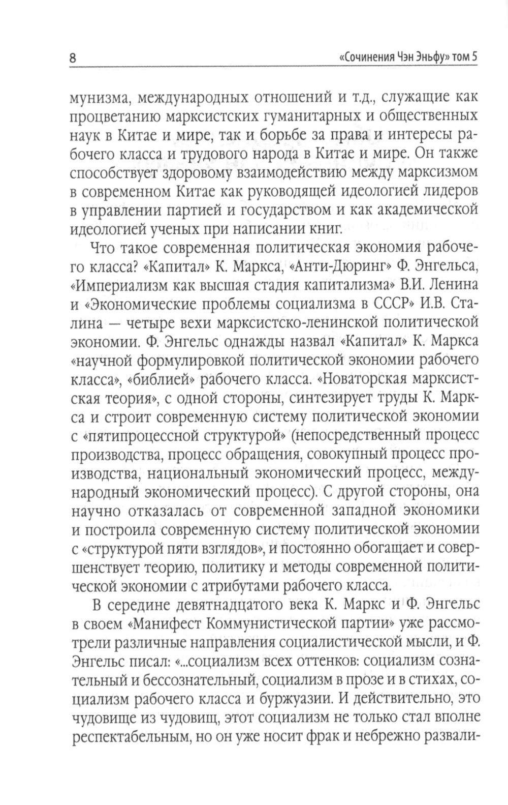 Мао Цзэдун хорошо сказал: «С грохотом Октябрьской революции марксизм-ленинизм был доставлен нам». Коммунистическая партия Китая, возглавляемая Мао Цзэдуном, объединила марксизм-ленинизм с китайской действительностью и, опираясь на огромное количество трудового народа, захватила власть и в 1949 году создала Китайскую Народную Республику. Чэн Эньфу, академик Китайской академии общественных наук и главный профессор Университета Китайской академии общественных наук, является одним из известных китайских экономистов и пользуется высокой репутацией в области исследований марксистской политэкономии в Китае. Он также привержен распространению результатов китайской марксистской теории в России. Си Цзиньпин сказал: «Мы хотим, чтобы мир знал не только «Китай на кончике языка», но и «Китай в научных кругах», «Китай в теории» и «Китай в философии и социальных науках». Именно к этому стремится и автор Чэн Эньфу, изучая и пропагандируя китайский марксизм - как передовой строй современного общества. Данная книга Чэн Эньфу. Том 5 (2003-2004) адресована большинству энтузиастов марксистской экономики, исследователям высших учебных заведений и научно-исследовательских институтов. Когда все статьи в этой книге были отобраны и отредактированы, автор сам лично пересмотрел и подтвердил их