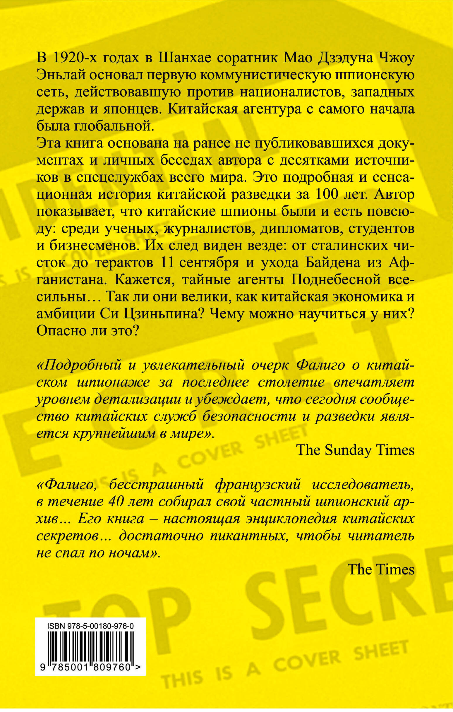 В 1920-х годах в Шанхае соратник Мао Дзэдуна Чжоу Эньлай основал первую коммунистическую шпионскую сеть, действовавшую против националистов, западных держав и японцев. Китайская агентура с самого начала была глобальной. Эта книга основана на ранее не публиковавшихся документах и личных беседах автора с десятками источников в спецслужбах всего мира. Это подробная и сенсационная история китайской разведки за 100 лет. Автор показывает, что китайские шпионы были и есть повсюду: среди ученых, журналистов, дипломатов, студентов и бизнесменов. Их след виден везде: от сталинских чисток до терактов 11 сентября и ухода Байдена из Афганистана. Кажется, тайные агенты Поднебесной всесильны… Так ли они велики, как китайская экономика и амбиции Си Цзиньпина? Чему можно научиться у них? Опасно ли это? «Подробный и увлекательный очерк Фалиго о китайском шпионаже за последнее столетие впечатляет уровнем детализации и убеждает, что сегодня сообщество китайских служб безопасности и разведки является крупнейшим в мире». - The Sunday Times «Фалиго, бесстрашный французский исследователь, в течение 40 лет собирал свой частный шпионский архив… Его книга - настоящая энциклопедия китайских секретов… достаточно пикантных, чтобы читатель не спал по ночам». - The Times| Издательство | Родина Издательство ООО |