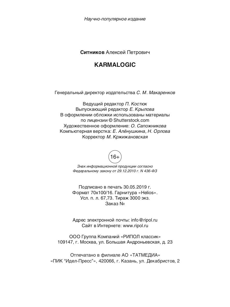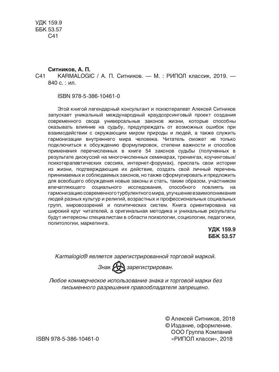 Этой книгой легендарный консультант и психотерапевт Алексей Ситников запускает уникальный международный краудсорсинговый проект создания современного свода универсальных законов жизни, которые способны оказывать влияние на судьбу, предупреждать от возможных ошибок при взаимодействии с окружающим миром природы и людей, а также служить гармонизации внутреннего мира человека. Читатель сможет не только подключиться к обсуждению формулировок, степени важности и способов применения перечисленных б книге 54 законов судьбы (полученных в результате дискуссий на многочисленных семинарах, тренингах, коучинговых/ психотерапевтических сессиях, интернет-форумах), прислать свои истории из жизни, подтверждающие их действие, создать свой личный перечень принимаемых и соблюдаемых законов, но также сформулировать и предложить для всеобщего обсуждения новые законы и стать, таким образом, участником впечатляющего социального исследования, способного повлиять на гармонизацию современного турбулентного мира, улучшение взаимопонимания людей разных культур и религий, возрастных и профессиональных социальных групп, мировоззрений и политических систем. Книга ориентирована на широкий круг читателей, а оригинальная методика и уникальные результаты будут интересны специалистам в области психологии, социологии, педагогики, политологии, маркетинга.| Издательство | Рипол Классик |