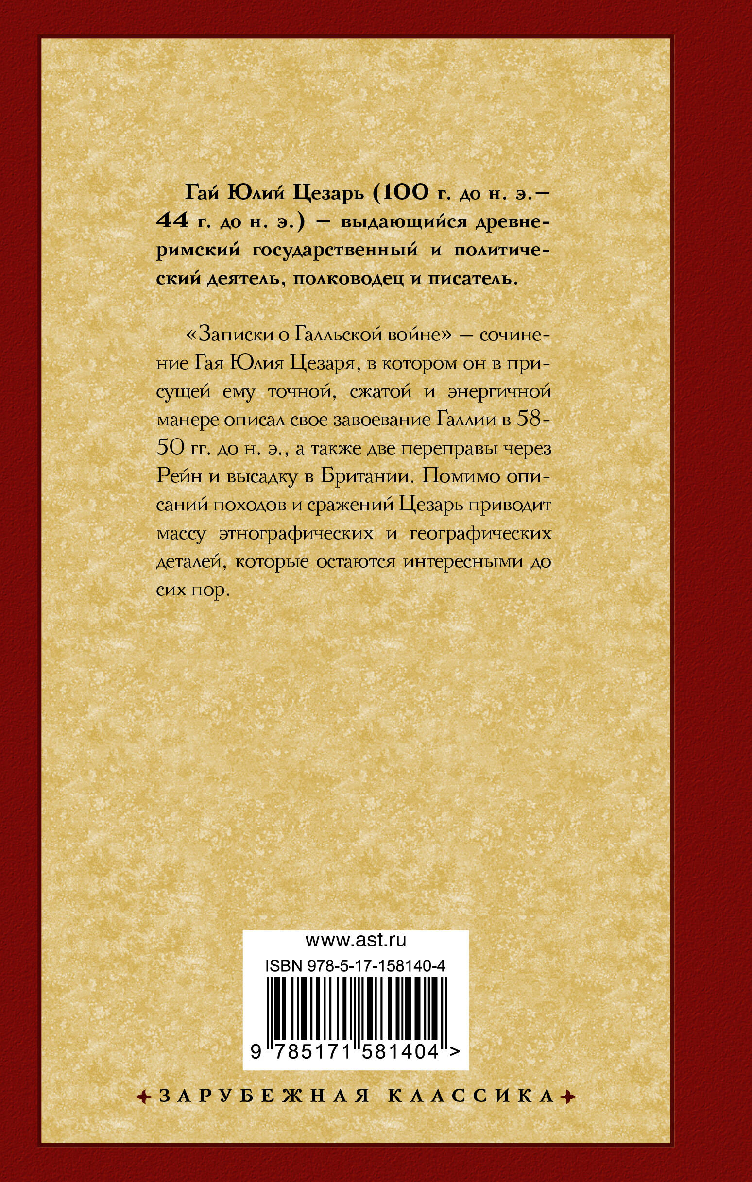 "Записки о Галльской войне" - сочинение Гая Юлия Цезаря, в восьми книгах которого он в присущей ему точной, сжатой и энергичной манере описал своё завоевание Галлии в 58-50 гг. до н. э., а также две переправы через Рейн и высадку в Британии. Помимо описаний походов и сражений Цезарь приводит массу этнографических и географических деталей, которые остаются интересными до сих пор.| Издательство | ИЗДАТЕЛЬСТВО "АСТ" |