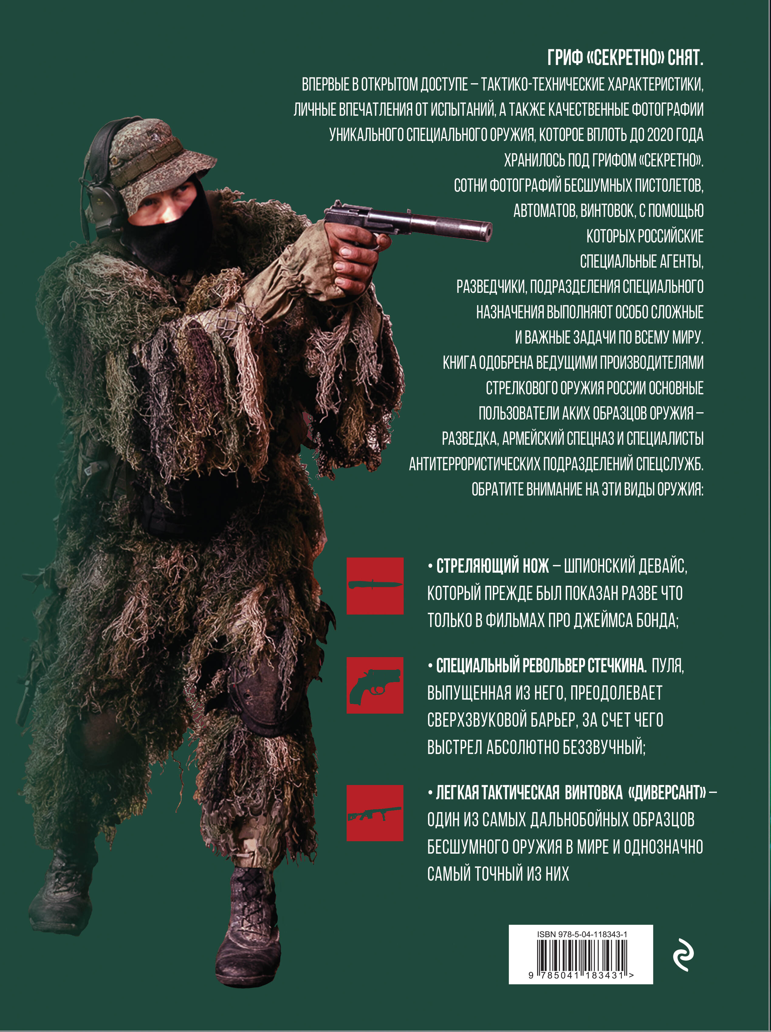 ГРИФ «СЕКРЕТНО» СНЯТ! КНИГА ОДОБРЕНА ВЕДУЩИМИ ПРОИЗВОДИТЕЛЯМИ СТРЕЛКОВОГО ОРУЖИЯ РОССИИ. Впервые в открытом доступе - тактико-технические характеристики, личные впечатления от испытаний, а также качественные фотографии уникального специального оружия, которое вплоть до 2020 года хранилось под грифом «СЕКРЕТНО». Сотни фотографий бесшумных пистолетов, автоматов, винтовок, с помощью которых российские специальные агенты, разведчики, подразделения специального назначения выполняют особо сложные и важные задачи по всему миру. Автор - ведущий эксперт в области огнестрельного оружия, имеет большой опыт работы с большинством образцов боевого оружия, лично протестировал каждое из них на стрельбищах. За время своей профессиональной деятельности освещал служебно-боевую работу подразделений специального назначения ФСБ, ФСО, МВД, Росгвардии, Минобороны, ФСКН, ФСИН. Уникальные новинки, которые способны поразить не только цель, но и воображение: • Стреляющий нож - шпионский девайс , который прежде был показан разве что только в фильмах про Джеймса Бонда. • Специальный револьвер Стечкина. Пуля, выпущенная из него, преодолевает СВЕРХЗВУКОВОЙ БАРЬЕР, за счет чего выстрел АБСОЛЮТНО БЕЗЗВУЧНЫЙ. • Легкая тактическая винтовка «Диверсант» - один из самых дальнобойных образцов бесшумного оружия и однозначно самый точный из них. Основные разделы книги: • Бесшумные пистолеты. • Бесшумные автоматы. • Бесшумные снайперские винтовки. • Бесшумные автоматно-гранатометные комплексы. • Подводное оружие.| Издательство | Эксмо |