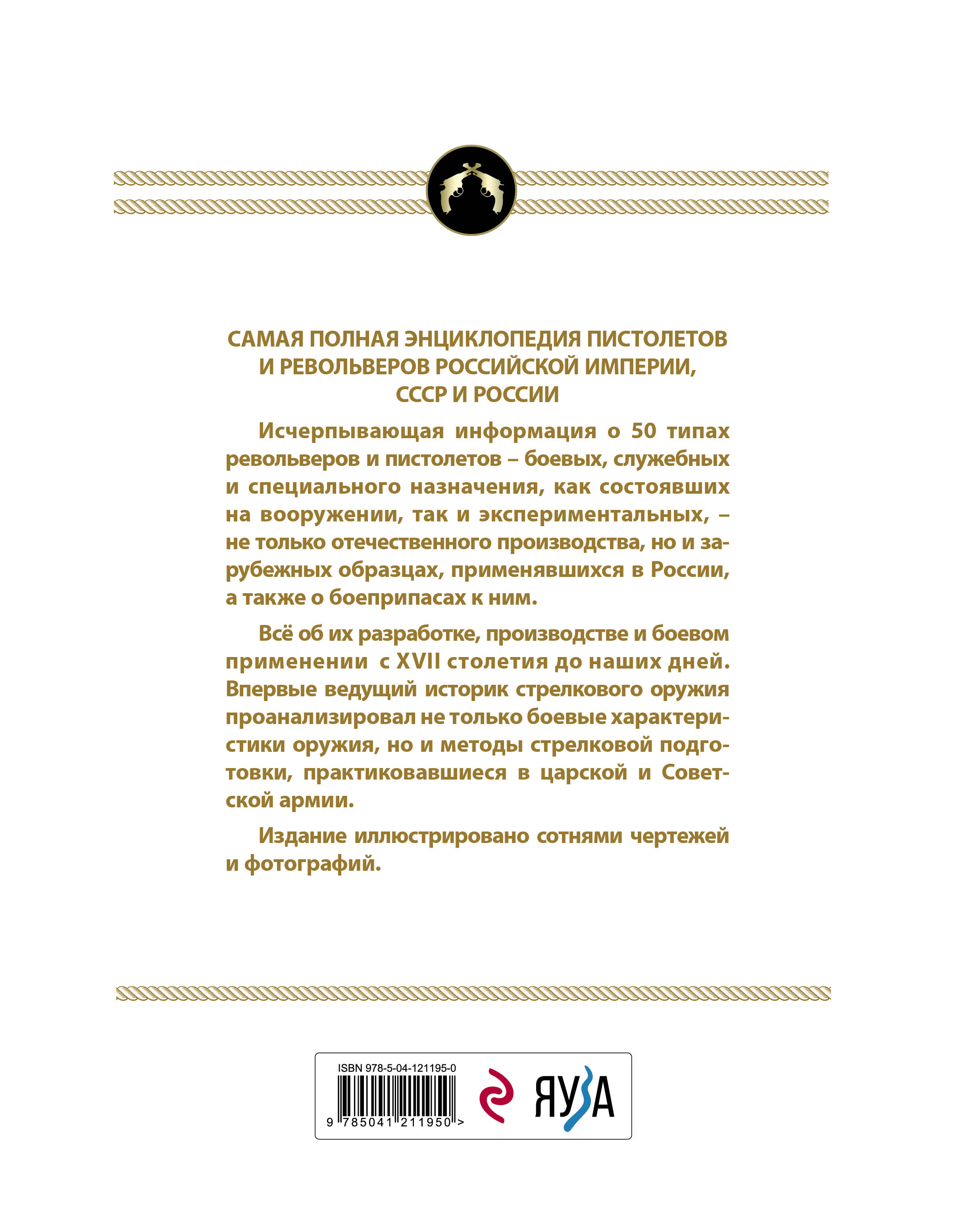 САМАЯ ПОЛНАЯ ЭНЦИКЛОПЕДИЯ ПИСТОЛЕТОВ И РЕВОЛЬВЕРОВ РОССИЙСКОЙ ИМПЕРИИ, СССР И РОССИИ. Исчерпывающая информация о 50 типах револьверов и пистолетов - боевых, служебных и специального назначения, как состоявших на вооружении, так и экспериментальных, - не только отечественного производства, но и зарубежных образцах, применявшихся в России, а также о боеприпасах к ним. Всё об их разработке, производстве и боевом применении с XVII столетия до наших дней. Впервые ведущий историк стрелкового оружия проанализировал не только боевые характеристики оружия, но и методы стрелковой подготовки, практиковавшиеся в царской и Советской армии. Издание иллюстрировано сотнями чертежей и фотографий.| Издательство | ООО "Издательство "Эксмо" |