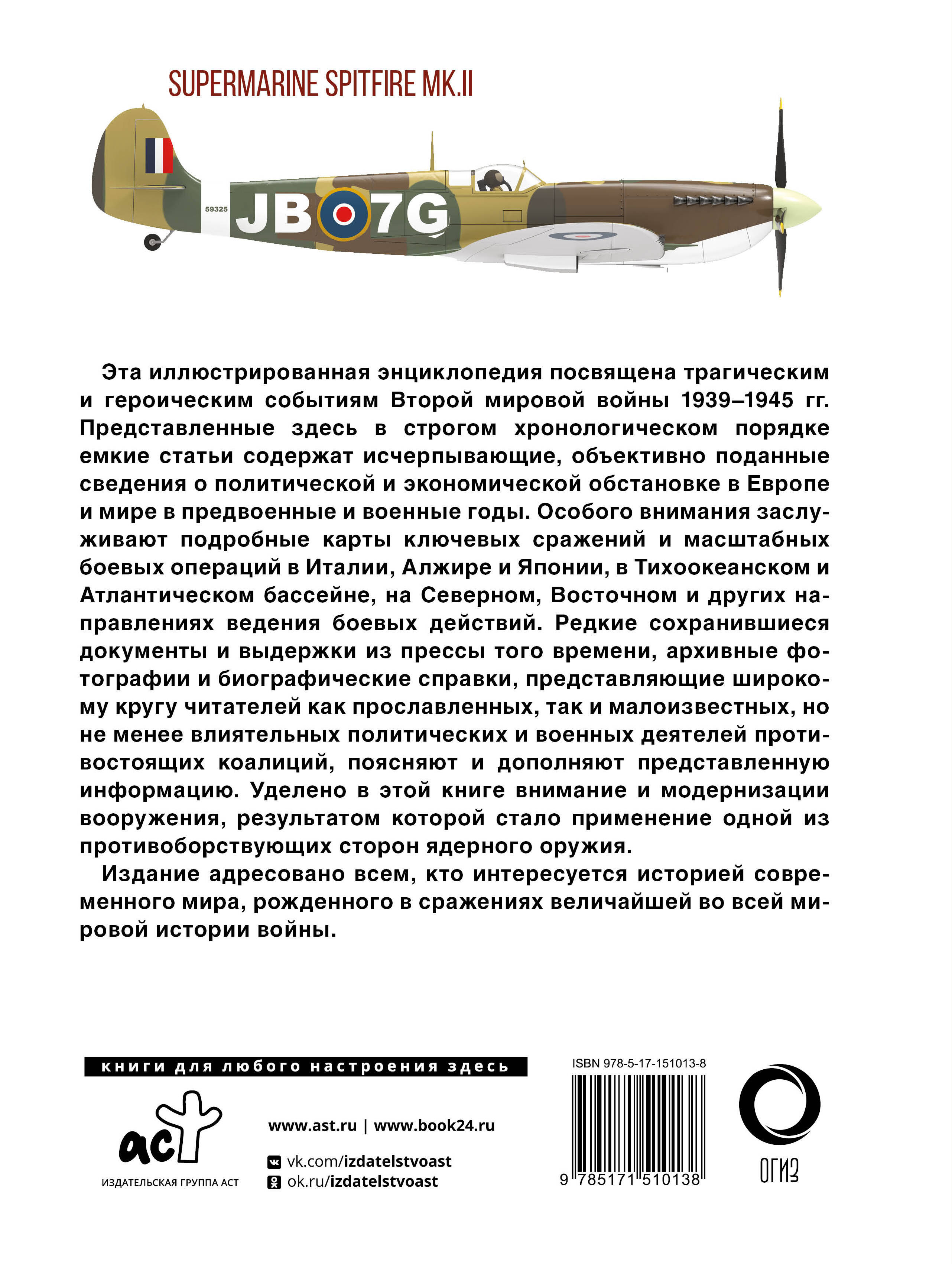 Эта иллюстрированная энциклопедия посвящена трагическим и героическим событиям Второй мировой войны 1939-1945 гг. Представленные здесь в хронологическом порядке емкие статьи содержат исчерпывающие объективно поданные сведения о политической и экономической обстановке в Европе и мире в предвоенные и военные годы. Уделено внимание и модернизации вооружения, результатом которой стало применение одной из противоборствующих сторон ядерного оружия. Особого внимания заслуживают подробные карты ключевых сражений и масштабных боевых операций в Италии, Алжире и Японии, в Тихоокеанском и Атлантическом бассейнах, на Северном, Восточном и других направлениях ведения боевых действий. Редкие сохранившиеся документы и выдержки из прессы того времени, архивные фотографии и биографические справки, представляющие читателю как прославленных, так и малоизвестных, но не менее влиятельных политических и военных деятелей противостоящих коалиций, поясняют и дополняют представленную информацию. Издание адресовано всем, кто интересуется военной историей.| Издательство | ИЗДАТЕЛЬСТВО "АСТ" |