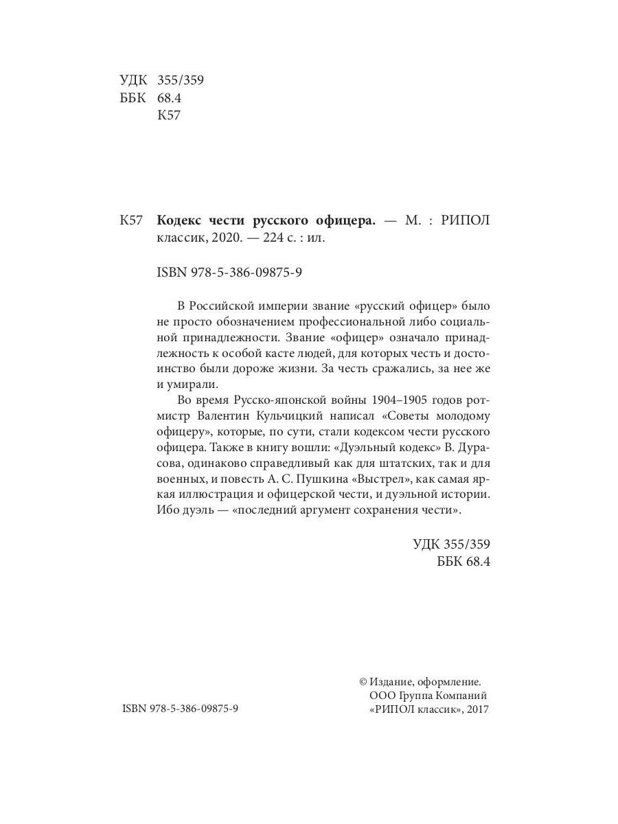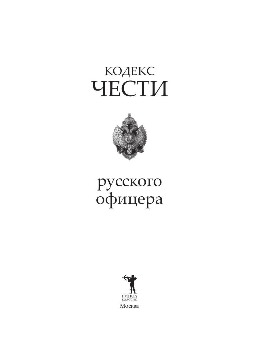 В Российской империи звание «русский офицер» было не просто обозначением профессиональной либо социальной принадлежности. Звание «офицер» означало принадлежность к особой касте людей, для которых честь и достоинство были дороже жизни. За честь сражались, за нее же и умирали. Во время Русско-японской войны 1904-1905 годов ротмистр Валентин Кульчицкий написал «Советы молодому офицеру», которые, по сути, стали кодексом чести русского офицера. Также в книгу вошли: «Дуэльный кодекс» В. Дурасова, одинаково справедливый как для штатских, так и для военных, и повесть А. С. Пушкина «Выстрел», как самая яркая иллюстрация и офицерской чести, и дуэльной истории. Ибо дуэль - «последний аргумент сохранения чести».