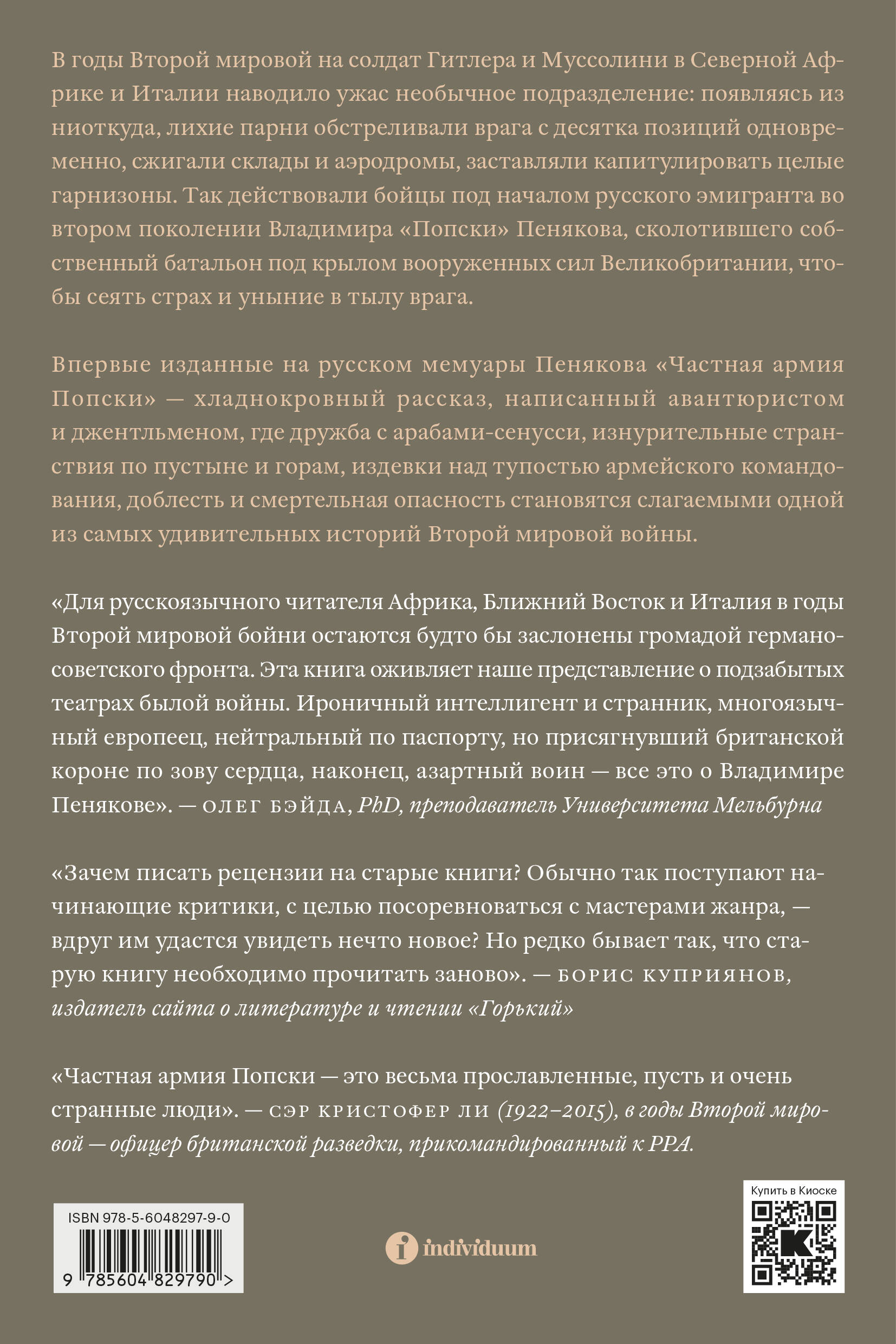 В годы Второй мировой на солдат Гитлера и Муссолини в Северной Африке и Италии наводило ужас необычное подразделение: появляясь из ниоткуда, лихие парни обстреливали врага с десятка позиций одновременно, сжигали склады и аэродромы, заставляли капитулировать целые гарнизоны. Так действовали бойцы под началом русского эмигранта во втором поколении Владимира «Попски» Пенякова, сколотившего собственный батальон под крылом вооруженных сил Великобритании, чтобы сеять страх и уныние в тылу врага. Впервые изданные на русском мемуары Пенякова «Частная армия Попски» - хладнокровный рассказ, написанный авантюристом и джентльменом, где дружба с арабами-сенусси, изнурительные странствия по пустыне и горам, издевки над тупостью армейского командования, доблесть и смертельная опасность становятся слагаемыми одной из самых удивительных историй Второй мировой войны.| Издательство | ИНДИВИДУУМ ПРИНТ ООО |