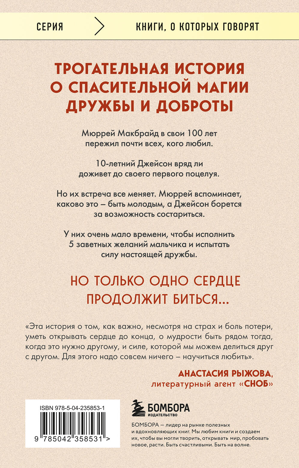 Трогательная история о спасительной магии дружбы и доброты. Мюррей Макбрайд в свои 100 лет пережил почти всех, кого любил. 10-летний Джейсон вряд ли доживет до своего первого поцелуя. Но их встреча все меняет. Мюррей вспоминает, каково это - быть молодым, а Джейсон борется за возможность состариться. У них очень мало времени, чтобы исполнить 5 заветных желаний мальчика и испытать силу настоящей дружбы. Но только одно сердце продолжит биться... «Эта история о том, как важно, несмотря на страх и боль потери, уметь открывать сердце до конца, о мудрости быть рядом тогда, когда это нужно другому, и силе, которой мы можем делиться друг с другом. Для этого надо совсем ничего - научиться любить». - Анастасия Рыжова, литературный агент «Сноб»| Издательство | ООО "Издательство "Эксмо" |
