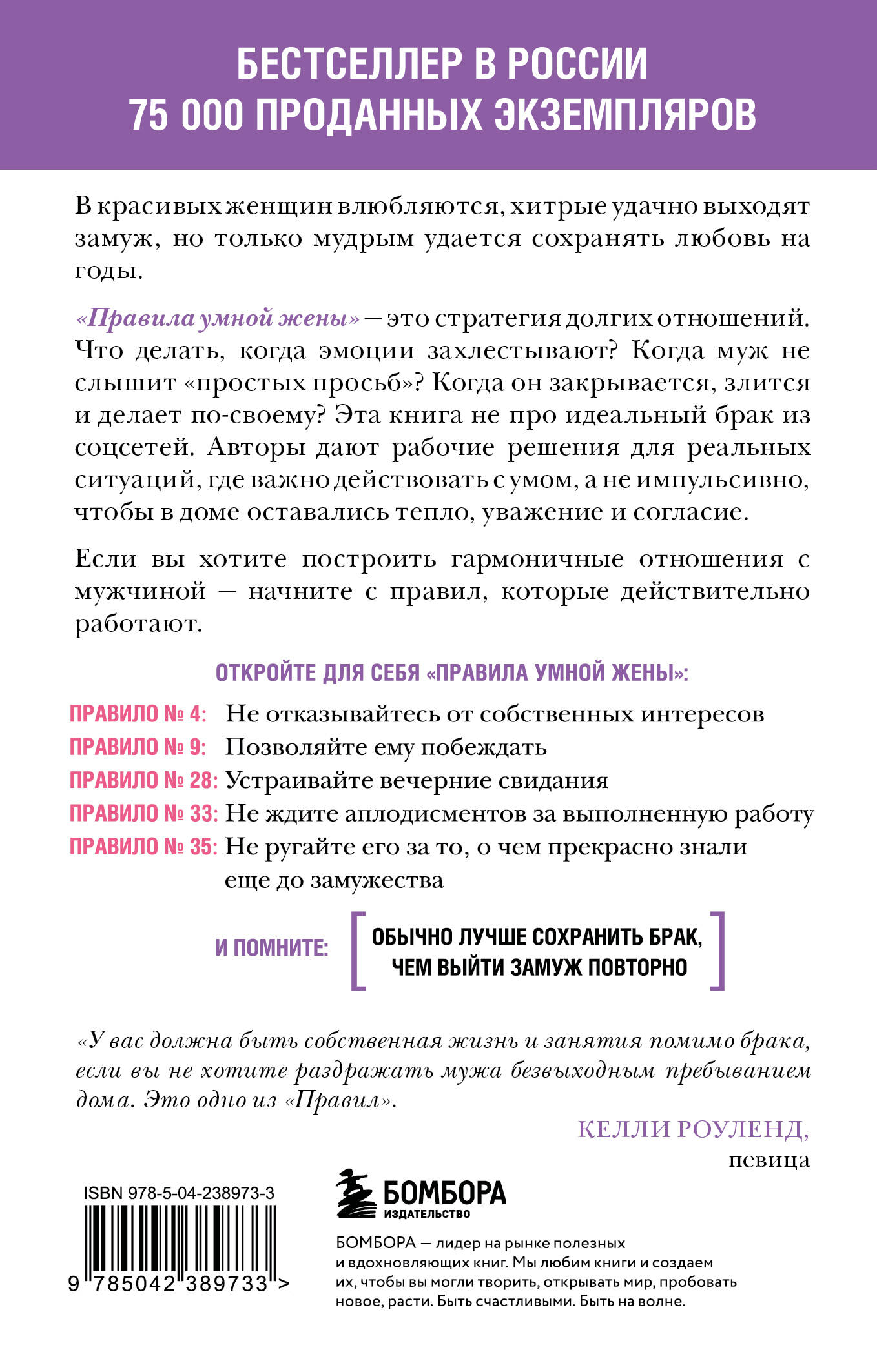 ЧТО ТАКОЕ «ПРАВИЛА УМНОЙ ЖЕНЫ» И ЗАЧЕМ ОНИ НУЖНЫ (отрывок из книги). Когда в 1995 году мы написали «Правила», то изучили всё, что работает и что не работает в период ухаживания. Мы заметили, что женщины, которых «трудно добиться», всегда получают своих мужчин, а чересчур доступные или озабоченные женщины частенько терпят неудачу. Мы составили 35 правил, которые помогали женщинам стать для мужчин желанными: «не заговаривайте с мужчинами первой», «заканчивайте свидание первой» и другие. Сколь бы трудны они ни были, но первые 3-4 месяца отношений нужно им следовать. В некоторых случаях стоит следовать им до тех пор, пока мужчина не сделает предложение: после этого вы уже понимаете, что он готов принять на себя обязательства и можно немного расслабиться. Брак же - это предприятие долгосрочное, поэтому «Правила умной жены» не так строги, но должны стать образом жизни. Правила для свиданий - это короткая диета: не стоит сразу заниматься сексом, желательно несколько месяцев оставаться таинственной и загадочной, чтобы он потерял от вас голову… (практически то же самое, что несколько месяцев отказываться от десерта, чтобы к лету влезть в свой купальник). «Правила умной жены» - это план на всю жизнь. Любая может скинуть пять килограммов, но далеко не все способны сохранить этот результат. Многим женщинам удается поймать мужчину, но сколько из них счастливы в браке? Наша задача на сей раз - не поймать мужчину, а удержать его. И для этого нужно сделать его счастливым, чтобы он чувствовал себя значимым. Следует быть чуткой, уметь играть в команде и… кое-что еще - прилагать все усилия, чтобы не пилить мужа и поддерживать его идеи и предложения. А для этого нужно потрудиться. К сожалению, большую часть эмоциональной работы в браке придется выполнять вам - нравится вам это или нет. Это дело не взаимное. Доказательства? Подумайте: эту книжку читаете вы, а не ваш муж. Он наверняка читает триллер или книгу о том, как заработать больше денег на фондовом рынке. Мы не обобщаем. Просто такова жизнь. Вашему партнеру может даже не понравиться то, что вы читаете эту книгу или обсуждаете ваши семейные проблемы с подругами или матерью. Подобно большинству мужчин, он не любит обсуждать с посторонними свою личную жизнь и считает, что вы вполне можете решить свои проблемы самостоятельно вместе с ним, поэтому мы не советуем обсуждать эту книгу с мужем или просить его ее прочитать. Даже если он согласится с большинством наших рекомендаций, ему не понравится, что вам пришлось прочитать книгу, чтобы понять, как к нему относиться. В действительности, чтобы семейная жизнь была счастливой, женщине следует относиться к мужу, как к клиенту, которого хочется сохранить (он всегда прав). Вы, наверное, думаете: «А почему нельзя жить на равных? Почему не он должен поступать так, как вы советуете, то есть не начинать первым ссору и первым идти на примирение?» Наш ответ прост: потому что такова жизнь. Мужчины и женщины разные. Они играют неодинаковые роли на этапе ухаживания, когда мужчина должен быть охотником. И в браке, когда большая часть эмоциональной работы в отношениях ложится на плечи женщин. Мы не собираемся это менять. Мы были бы рады дать вам иной совет, но наши основаны на человеческой природе, нравится она вам или нет. И поэтому они работают. Так что не пытайтесь заставить партнера игр
