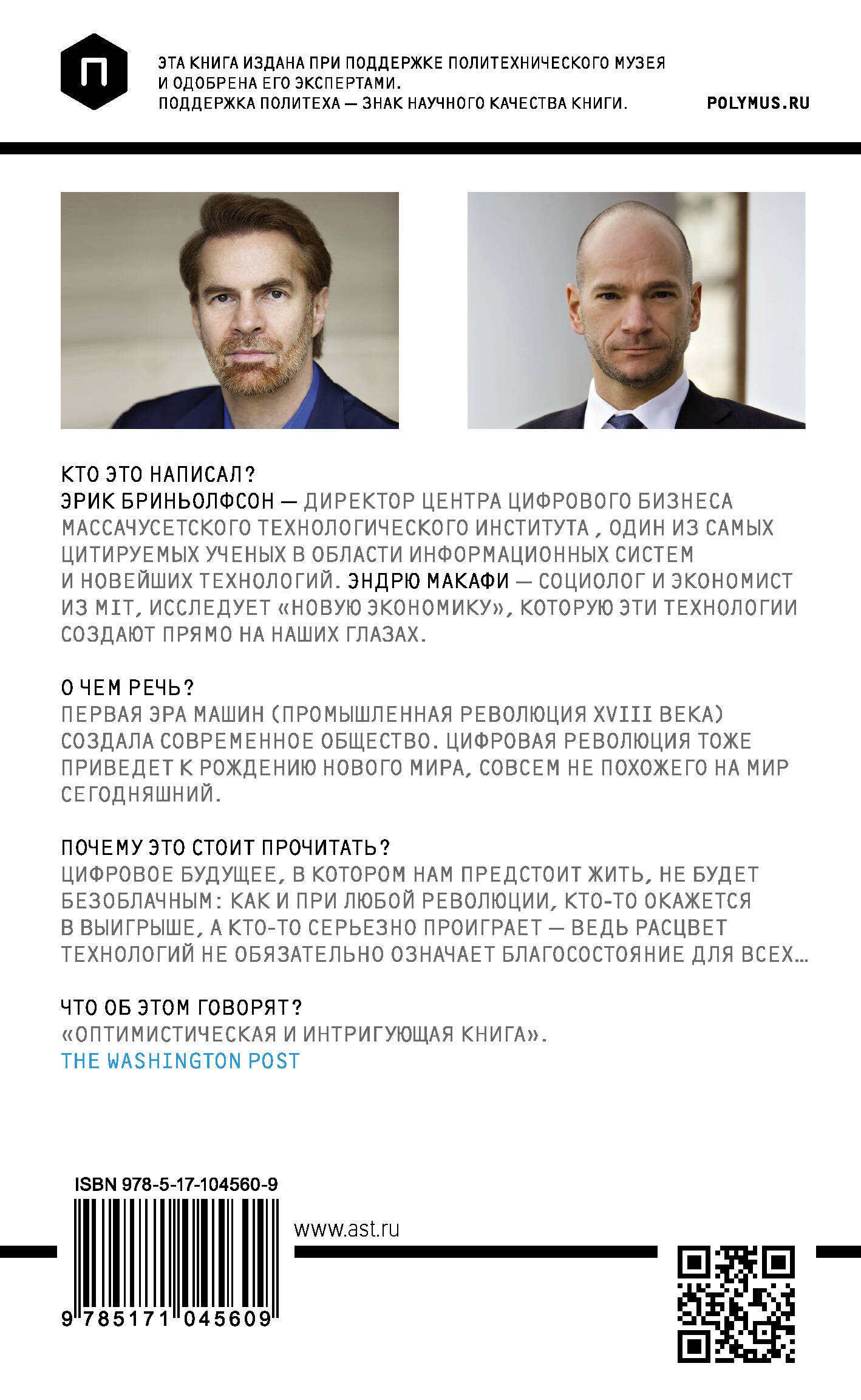 Беспилотные автомобили, нейронные сети, компьютерная диагностика заболеваний, использование Больших данных в самых разных сферах человеческой деятельности… Авторы этой книги, инженеры и ученые из Массачусетского технологического института, сравнивают стремительное развитие цифровых технологий, которое мы наблюдаем сегодня, с промышленной революцией XVIII столетия - первой "эрой машин". Промышленная революция положила начало современному миру, вторая эра машин тоже на наших глазах создает новый мир: все социальные структуры и экономические принципы будут пересмотрены, технологии коренным образом изменят буквально все стороны нашей жизни.| Издательство | ИЗДАТЕЛЬСТВО "АСТ" |
