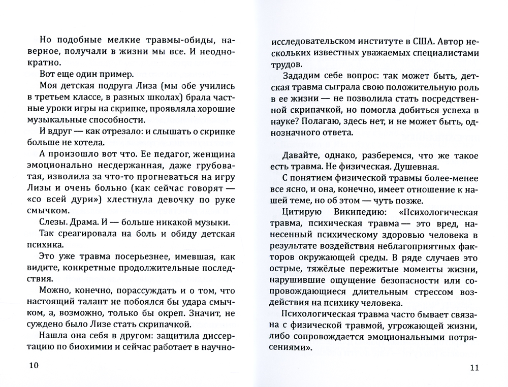 Книга психолога Натальи Кретовой «Психология детских травм» посвящена проработке детских травматических переживаний. В семи главах раскрываются основные принципы работы с психическими травмами, давними обидами и другими незабытыми тяжелыми ситуациями, оказавшими негативное влияние на дальнейшую жизнь. В книге представлены авторские медитации, положительно повлиявшие на людей, детство которых было омрачено событиями, угрожающими жизни, внезапным вынужденным переездом, потерей близких людей, разводом родителей, жестоким отношением окружающих и др. Книга будет интересна как широкому кругу читателей, так и профессиональным психологам.| Издательство | Амрита-Русь |